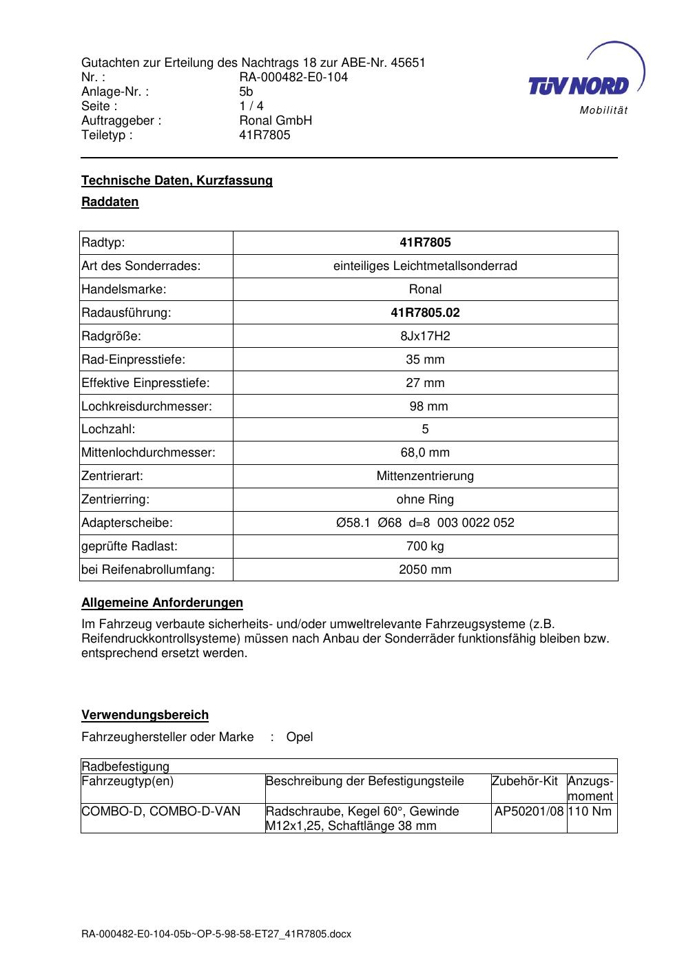 Dieses Gutachten (abe) bezieht sich auf die Alufelge brand-ronal 41R7805 in der Ausführung 8Jx17 ET 0, Mittenloch 0 mm (KBA 45651). Im PDF findest du typischerweise zulässige Reifengrößen, Auflagen/Anbauhinweise und – je nach Dokument – Hinweise zur Eintragung.