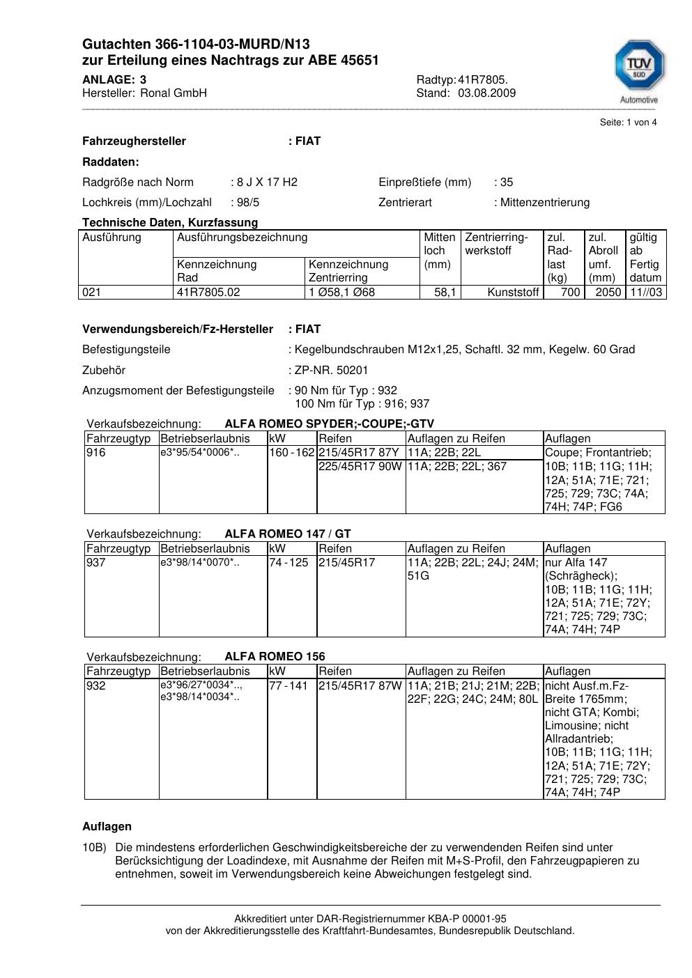 Dieses Gutachten (abe) bezieht sich auf die Alufelge Ronal 41R7805 in der Ausführung 8Jx17 ET 0, Mittenloch 0 mm (KBA 45651). Im PDF findest du typischerweise zulässige Reifengrößen, Auflagen/Anbauhinweise und – je nach Dokument – Hinweise zur Eintragung.