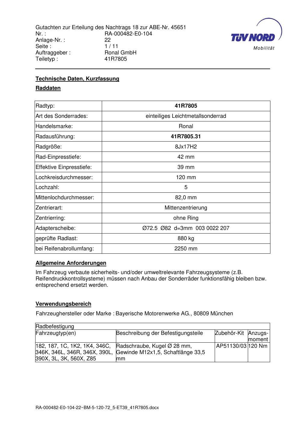 Dieses Gutachten (abe) bezieht sich auf die Alufelge brand-ronal 41R7805 in der Ausführung 8Jx17 ET 0, Mittenloch 0 mm (KBA 45651). Im PDF findest du typischerweise zulässige Reifengrößen, Auflagen/Anbauhinweise und – je nach Dokument – Hinweise zur Eintragung.