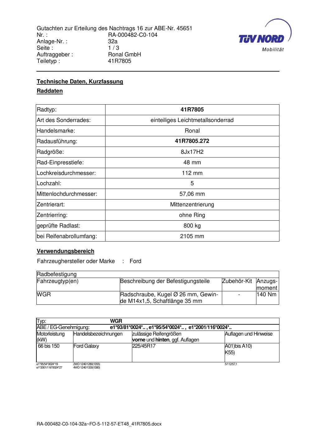 Dieses Gutachten (abe) bezieht sich auf die Alufelge brand-ronal 41R7805 in der Ausführung 8Jx17 ET 0, Mittenloch 0 mm (KBA 45651). Im PDF findest du typischerweise zulässige Reifengrößen, Auflagen/Anbauhinweise und – je nach Dokument – Hinweise zur Eintragung.