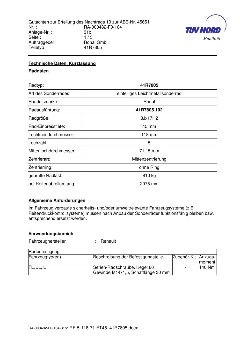 Dieses Gutachten (abe) bezieht sich auf die Alufelge brand-ronal 41R7805 in der Ausführung 8Jx17 ET 0, Mittenloch 0 mm (KBA 45651). Im PDF findest du typischerweise zulässige Reifengrößen, Auflagen/Anbauhinweise und – je nach Dokument – Hinweise zur Eintragung.