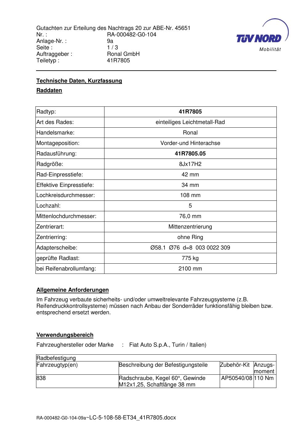 Dieses Gutachten (abe) bezieht sich auf die Alufelge brand-ronal 41R7805 in der Ausführung 8Jx17 ET 0, Mittenloch 0 mm (KBA 45651). Im PDF findest du typischerweise zulässige Reifengrößen, Auflagen/Anbauhinweise und – je nach Dokument – Hinweise zur Eintragung.