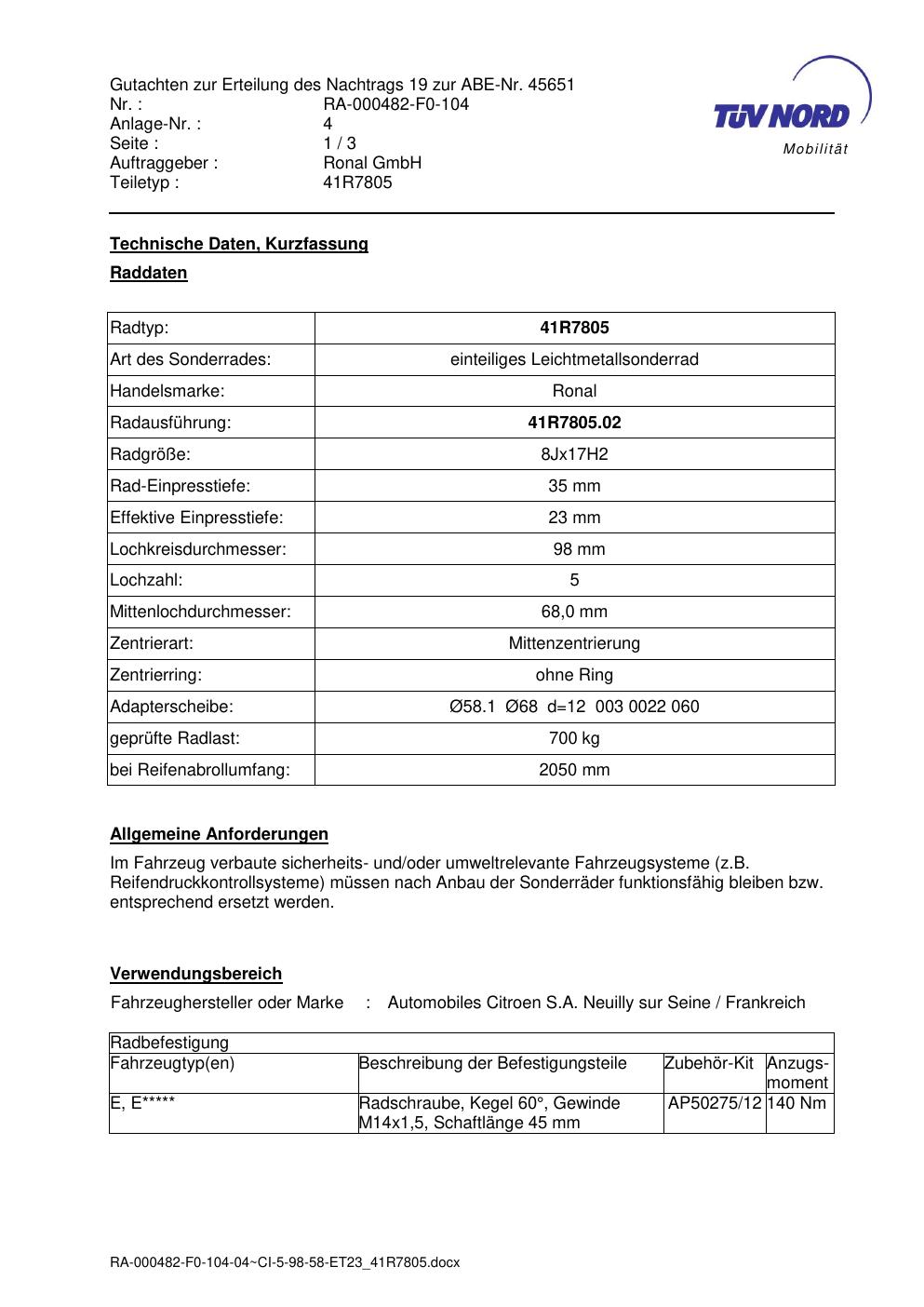 Dieses Gutachten (abe) bezieht sich auf die Alufelge brand-ronal 41R7805 in der Ausführung 8Jx17 ET 0, Mittenloch 0 mm (KBA 45651). Im PDF findest du typischerweise zulässige Reifengrößen, Auflagen/Anbauhinweise und – je nach Dokument – Hinweise zur Eintragung.