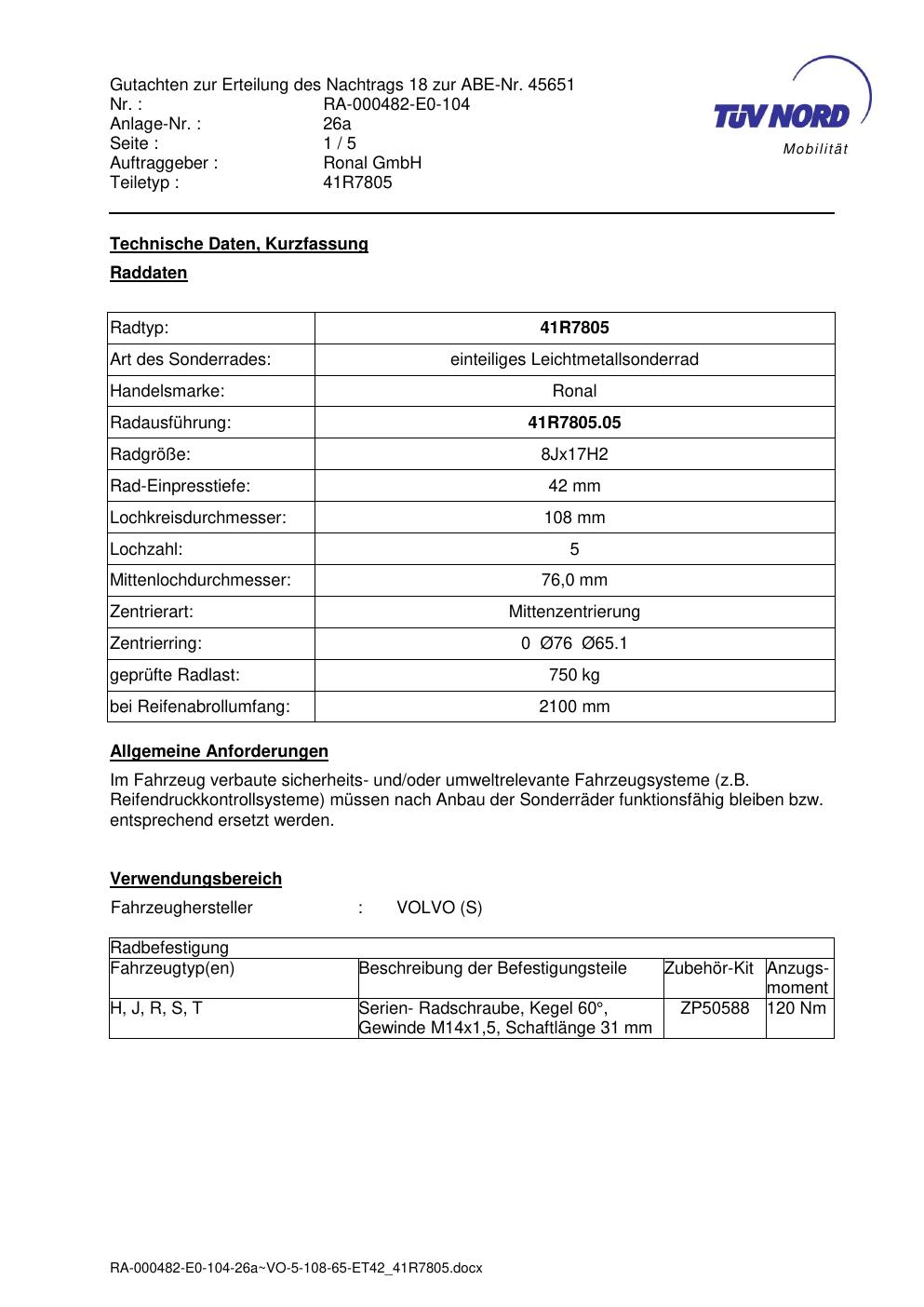 Dieses Gutachten (abe) bezieht sich auf die Alufelge brand-ronal 41R7805 in der Ausführung 8Jx17 ET 0, Mittenloch 0 mm (KBA 45651). Im PDF findest du typischerweise zulässige Reifengrößen, Auflagen/Anbauhinweise und – je nach Dokument – Hinweise zur Eintragung.