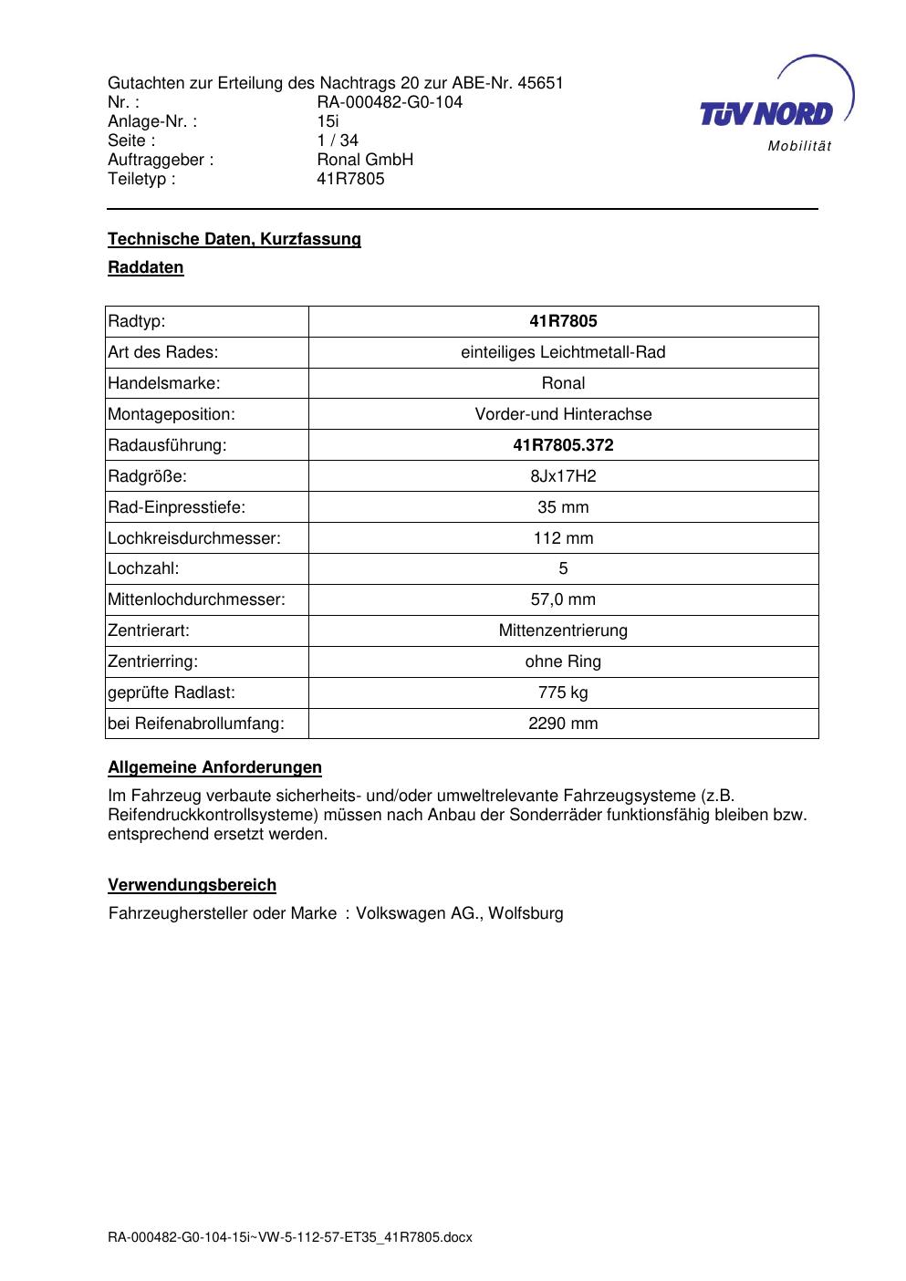 Dieses Gutachten (abe) bezieht sich auf die Alufelge brand-ronal 41R7805 in der Ausführung 8Jx17 ET 0, Mittenloch 0 mm (KBA 45651). Im PDF findest du typischerweise zulässige Reifengrößen, Auflagen/Anbauhinweise und – je nach Dokument – Hinweise zur Eintragung.