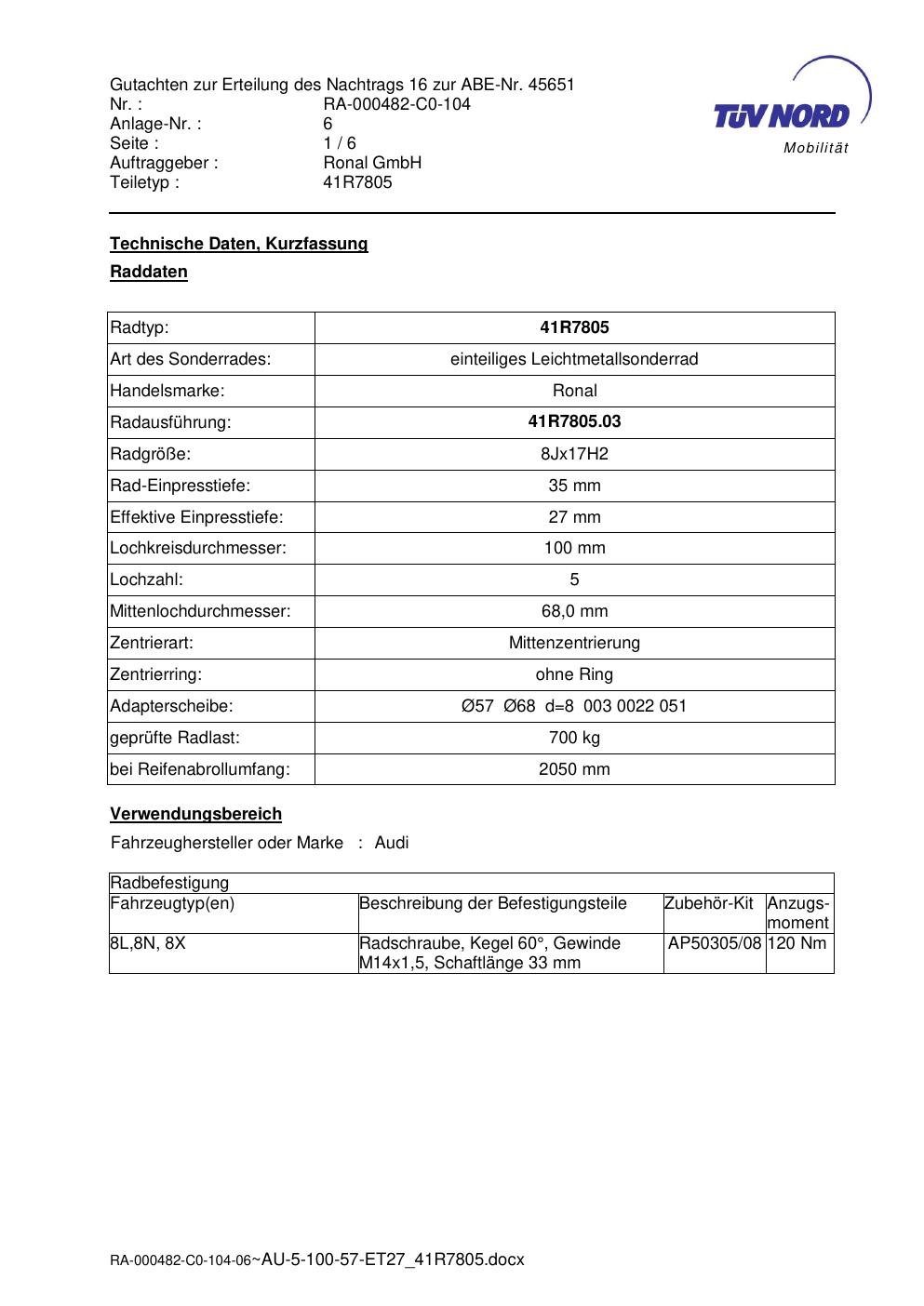 Dieses Gutachten (abe) bezieht sich auf die Alufelge brand-ronal 41R7805 in der Ausführung 8Jx17 ET 0, Mittenloch 0 mm (KBA 45651). Im PDF findest du typischerweise zulässige Reifengrößen, Auflagen/Anbauhinweise und – je nach Dokument – Hinweise zur Eintragung.