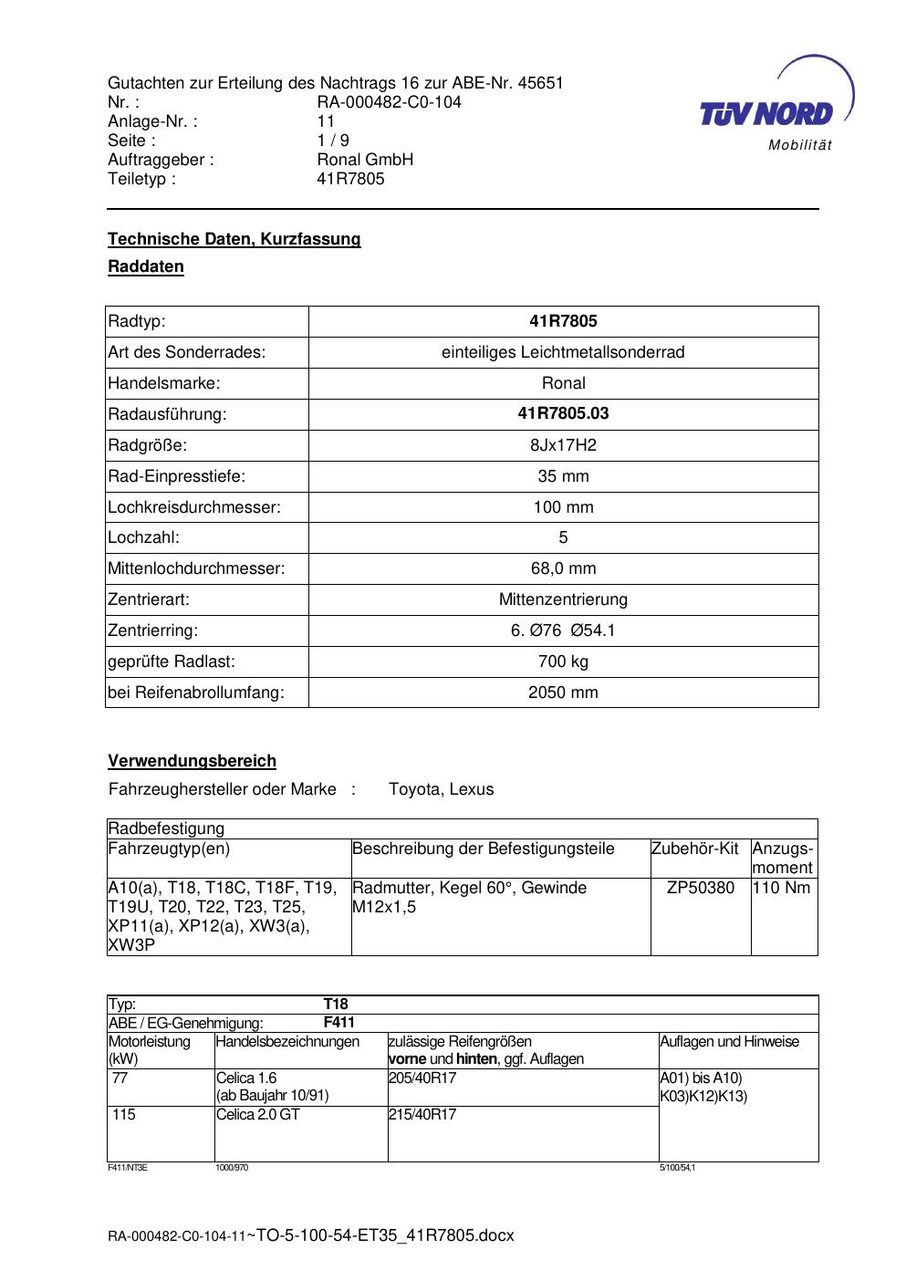 Dieses Gutachten (abe) bezieht sich auf die Alufelge brand-ronal 41R7805 in der Ausführung 8Jx17 ET 0, Mittenloch 0 mm (KBA 45651). Im PDF findest du typischerweise zulässige Reifengrößen, Auflagen/Anbauhinweise und – je nach Dokument – Hinweise zur Eintragung.