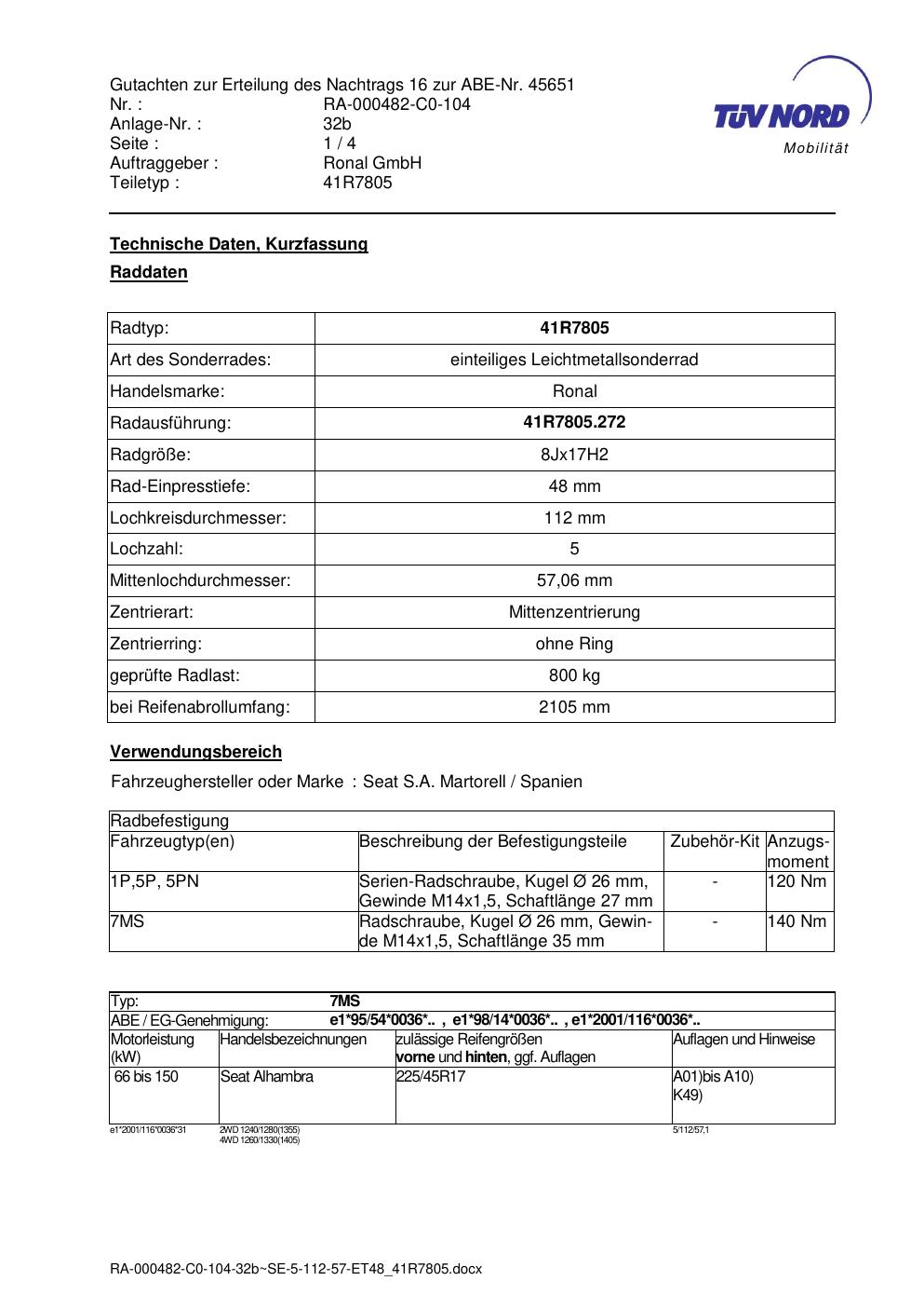 Dieses Gutachten (abe) bezieht sich auf die Alufelge brand-ronal 41R7805 in der Ausführung 8Jx17 ET 0, Mittenloch 0 mm (KBA 45651). Im PDF findest du typischerweise zulässige Reifengrößen, Auflagen/Anbauhinweise und – je nach Dokument – Hinweise zur Eintragung.