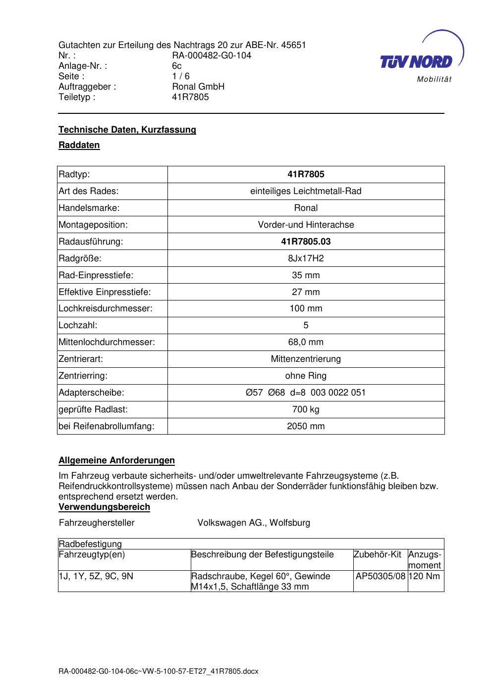 Dieses Gutachten (abe) bezieht sich auf die Alufelge brand-ronal 41R7805 in der Ausführung 8Jx17 ET 0, Mittenloch 0 mm (KBA 45651). Im PDF findest du typischerweise zulässige Reifengrößen, Auflagen/Anbauhinweise und – je nach Dokument – Hinweise zur Eintragung.