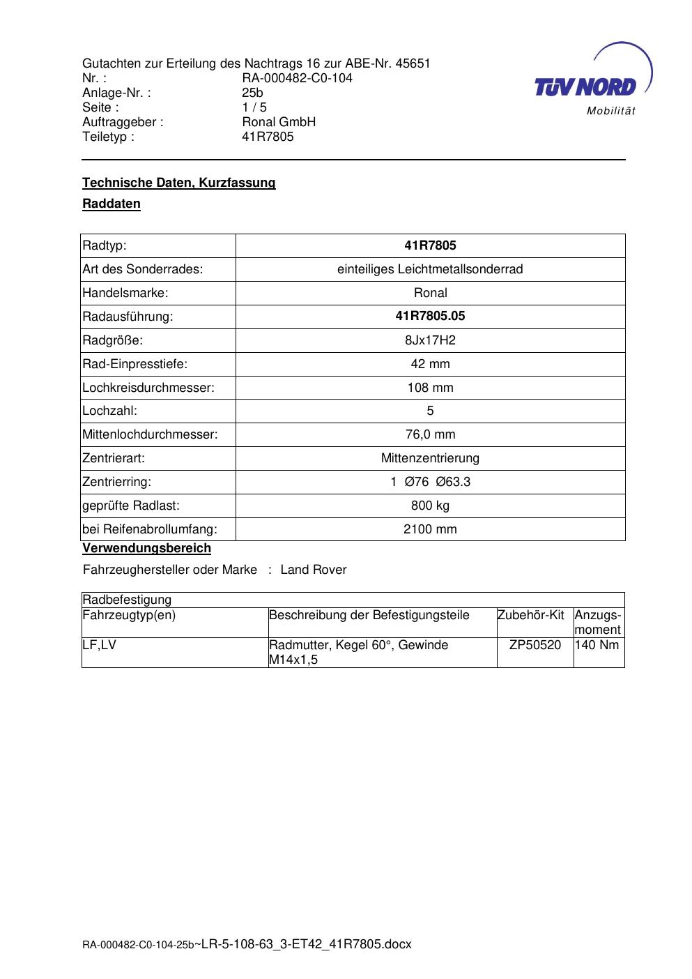 Dieses Gutachten (abe) bezieht sich auf die Alufelge brand-ronal 41R7805 in der Ausführung 8Jx17 ET 0, Mittenloch 0 mm (KBA 45651). Im PDF findest du typischerweise zulässige Reifengrößen, Auflagen/Anbauhinweise und – je nach Dokument – Hinweise zur Eintragung.