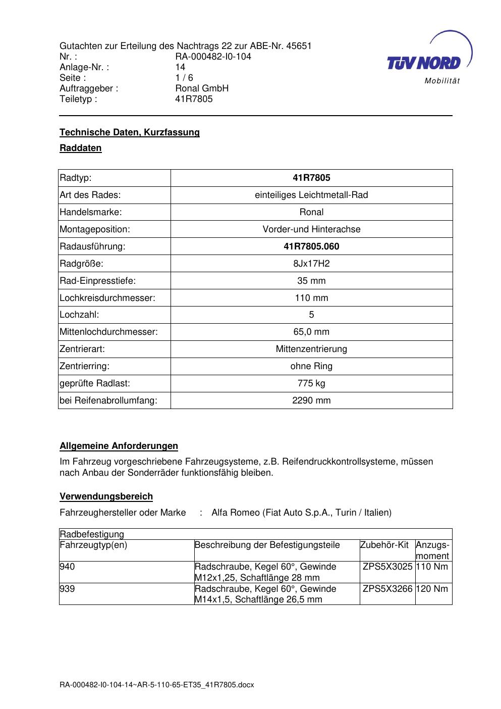Dieses Gutachten (abe) bezieht sich auf die Alufelge brand-ronal 41R7805 in der Ausführung 8Jx17 ET 0, Mittenloch 0 mm (KBA 45651). Im PDF findest du typischerweise zulässige Reifengrößen, Auflagen/Anbauhinweise und – je nach Dokument – Hinweise zur Eintragung.