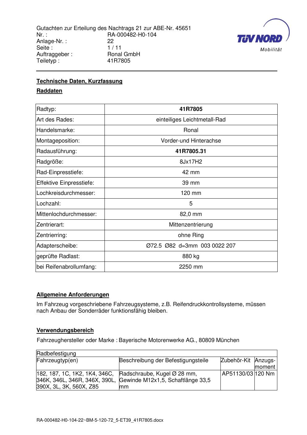 Dieses Gutachten (abe) bezieht sich auf die Alufelge brand-ronal 41R7805 in der Ausführung 8Jx17 ET 0, Mittenloch 0 mm (KBA 45651). Im PDF findest du typischerweise zulässige Reifengrößen, Auflagen/Anbauhinweise und – je nach Dokument – Hinweise zur Eintragung.
