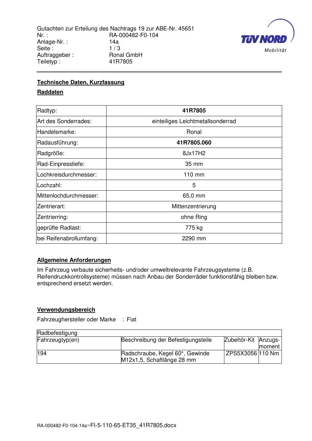 Dieses Gutachten (abe) bezieht sich auf die Alufelge brand-ronal 41R7805 in der Ausführung 8Jx17 ET 0, Mittenloch 0 mm (KBA 45651). Im PDF findest du typischerweise zulässige Reifengrößen, Auflagen/Anbauhinweise und – je nach Dokument – Hinweise zur Eintragung.