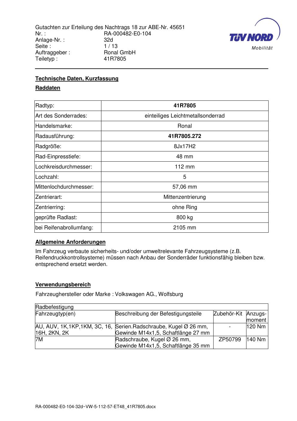 Dieses Gutachten (abe) bezieht sich auf die Alufelge brand-ronal 41R7805 in der Ausführung 8Jx17 ET 0, Mittenloch 0 mm (KBA 45651). Im PDF findest du typischerweise zulässige Reifengrößen, Auflagen/Anbauhinweise und – je nach Dokument – Hinweise zur Eintragung.