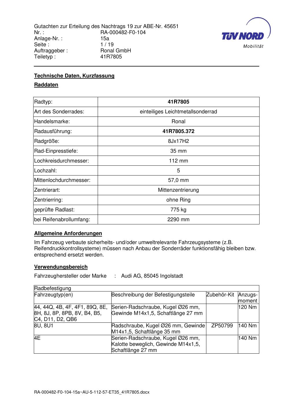Dieses Gutachten (abe) bezieht sich auf die Alufelge brand-ronal 41R7805 in der Ausführung 8Jx17 ET 0, Mittenloch 0 mm (KBA 45651). Im PDF findest du typischerweise zulässige Reifengrößen, Auflagen/Anbauhinweise und – je nach Dokument – Hinweise zur Eintragung.