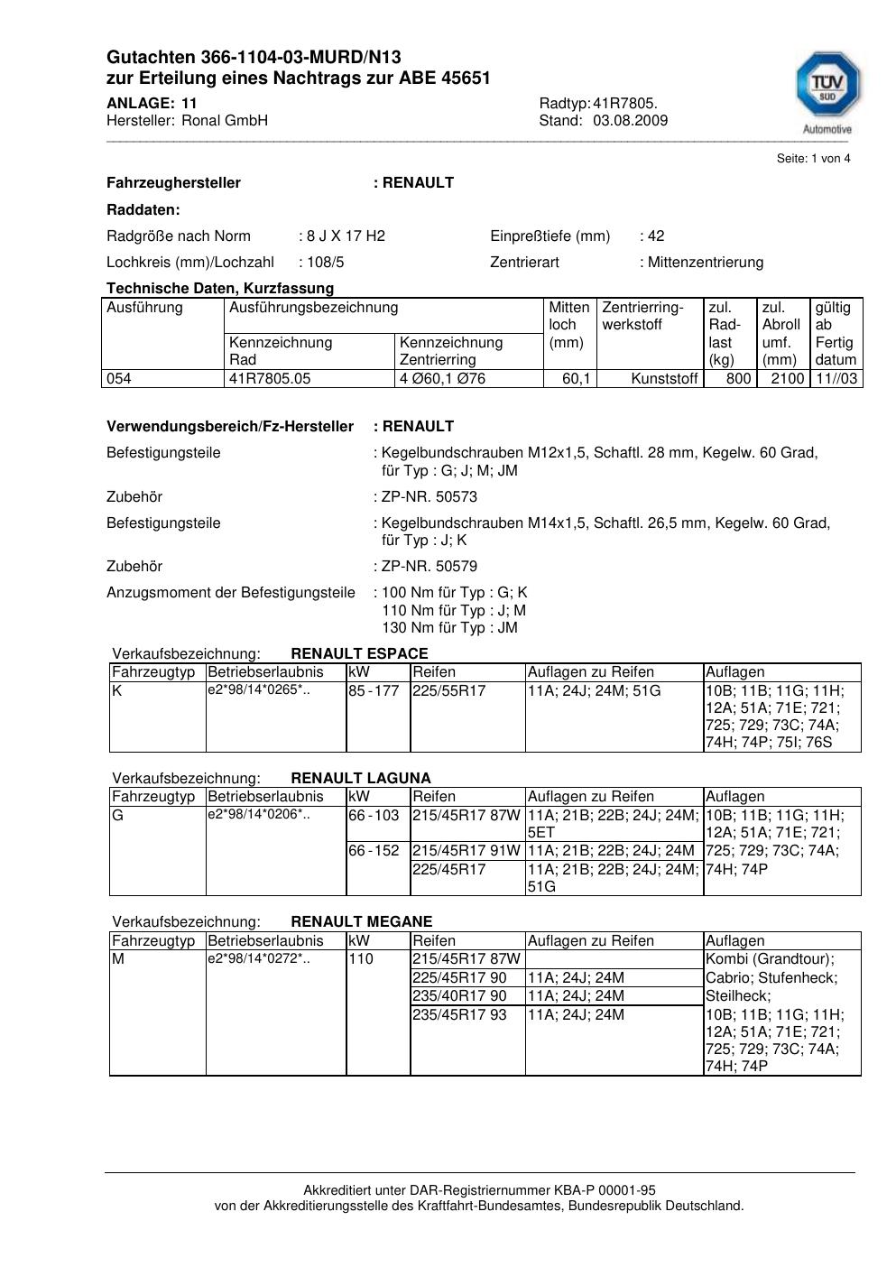 Dieses Gutachten (abe) bezieht sich auf die Alufelge Ronal 41R7805 in der Ausführung 8Jx17 ET 0, Mittenloch 0 mm (KBA 45651). Im PDF findest du typischerweise zulässige Reifengrößen, Auflagen/Anbauhinweise und – je nach Dokument – Hinweise zur Eintragung.