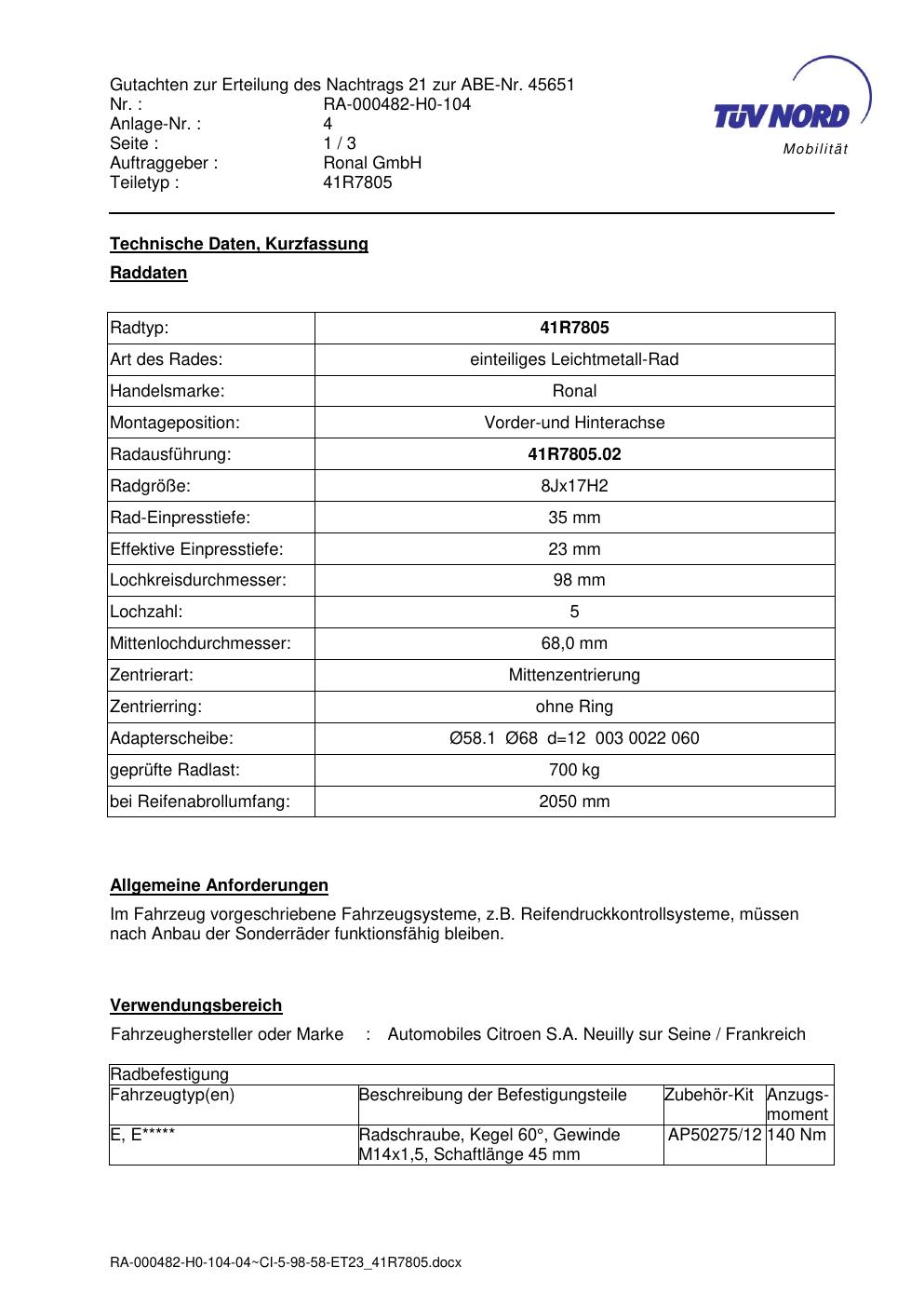 Dieses Gutachten (abe) bezieht sich auf die Alufelge brand-ronal 41R7805 in der Ausführung 8Jx17 ET 0, Mittenloch 0 mm (KBA 45651). Im PDF findest du typischerweise zulässige Reifengrößen, Auflagen/Anbauhinweise und – je nach Dokument – Hinweise zur Eintragung.