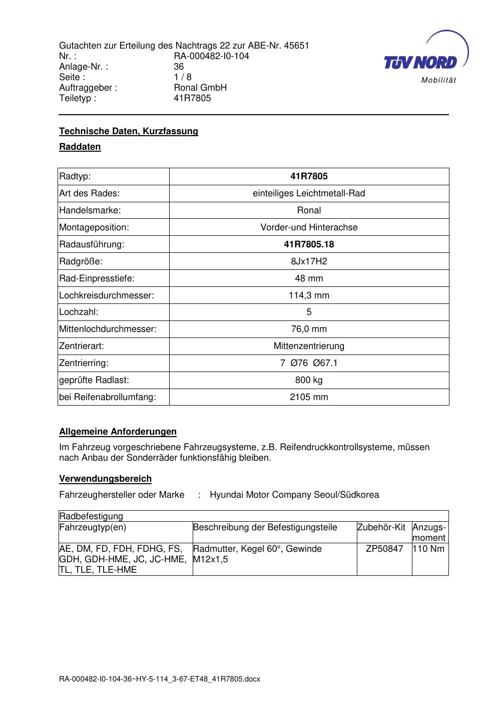 Dieses Gutachten (abe) bezieht sich auf die Alufelge brand-ronal 41R7805 in der Ausführung 8Jx17 ET 0, Mittenloch 0 mm (KBA 45651). Im PDF findest du typischerweise zulässige Reifengrößen, Auflagen/Anbauhinweise und – je nach Dokument – Hinweise zur Eintragung.
