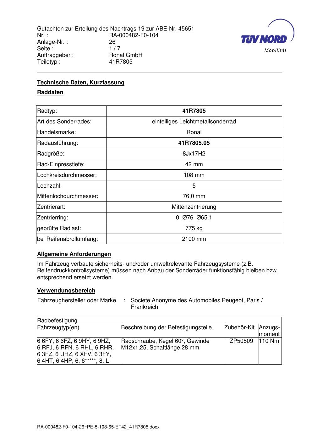 Dieses Gutachten (abe) bezieht sich auf die Alufelge brand-ronal 41R7805 in der Ausführung 8Jx17 ET 0, Mittenloch 0 mm (KBA 45651). Im PDF findest du typischerweise zulässige Reifengrößen, Auflagen/Anbauhinweise und – je nach Dokument – Hinweise zur Eintragung.