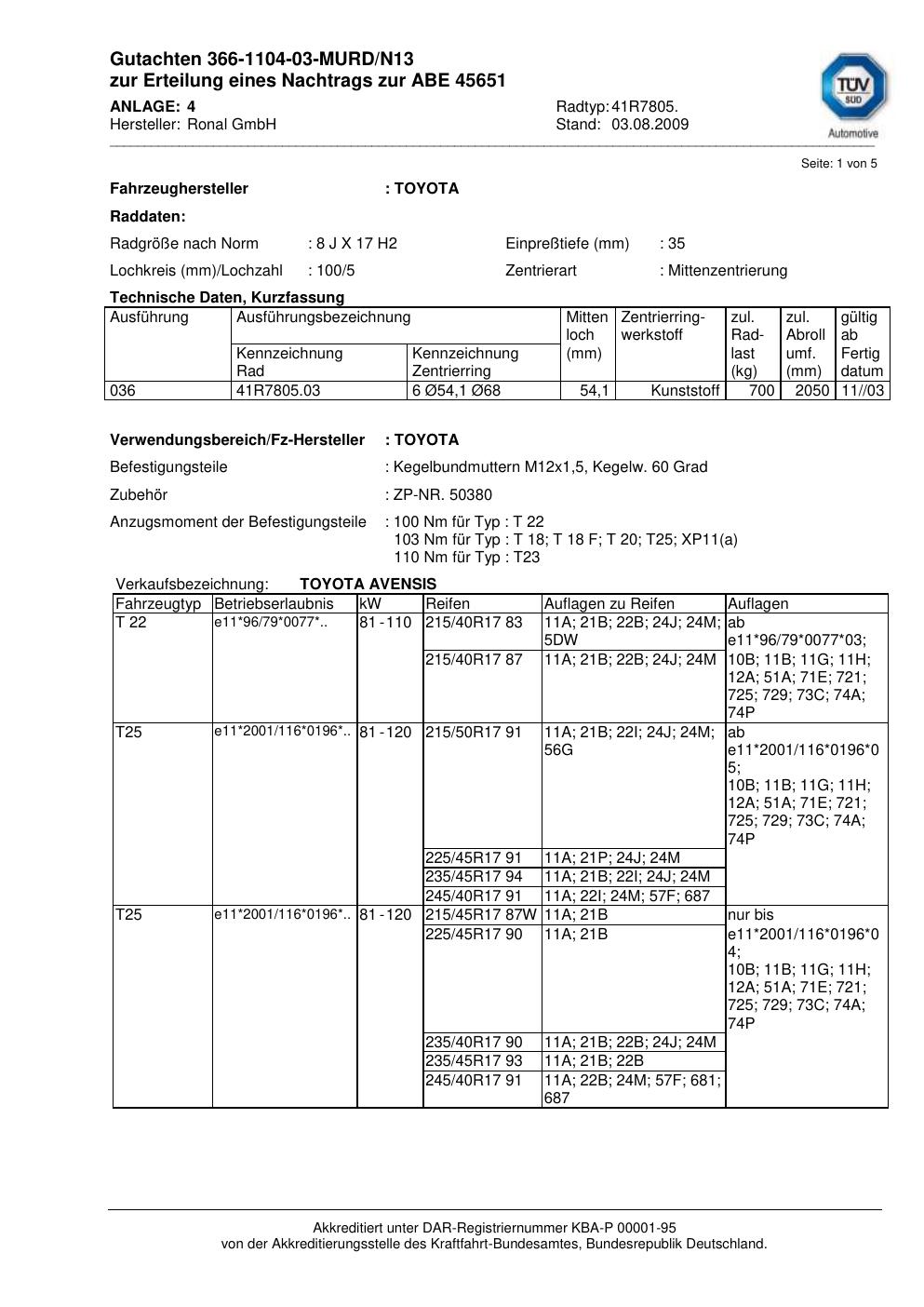 Dieses Gutachten (abe) bezieht sich auf die Alufelge Ronal 41R7805 in der Ausführung 8Jx17 ET 0, Mittenloch 0 mm (KBA 45651). Im PDF findest du typischerweise zulässige Reifengrößen, Auflagen/Anbauhinweise und – je nach Dokument – Hinweise zur Eintragung.