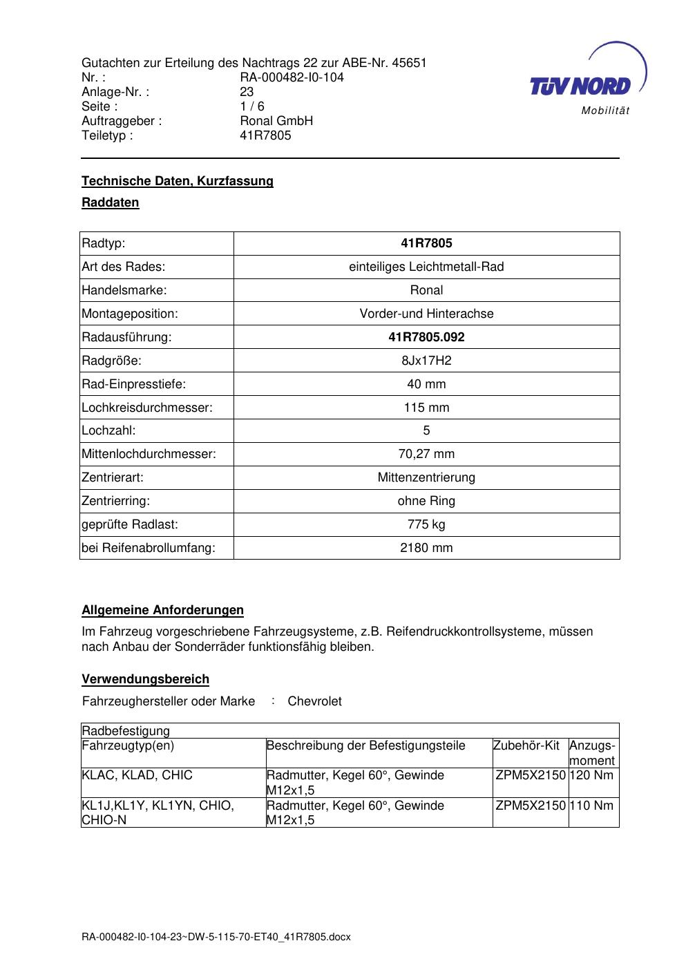 Dieses Gutachten (abe) bezieht sich auf die Alufelge brand-ronal 41R7805 in der Ausführung 8Jx17 ET 0, Mittenloch 0 mm (KBA 45651). Im PDF findest du typischerweise zulässige Reifengrößen, Auflagen/Anbauhinweise und – je nach Dokument – Hinweise zur Eintragung.