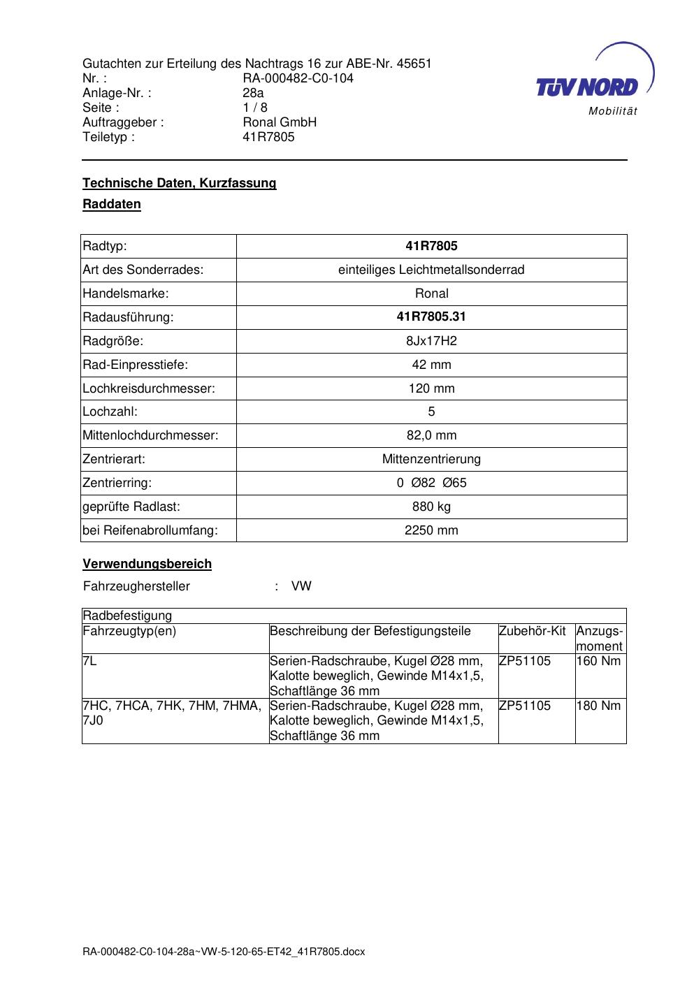 Dieses Gutachten (abe) bezieht sich auf die Alufelge brand-ronal 41R7805 in der Ausführung 8Jx17 ET 0, Mittenloch 0 mm (KBA 45651). Im PDF findest du typischerweise zulässige Reifengrößen, Auflagen/Anbauhinweise und – je nach Dokument – Hinweise zur Eintragung.