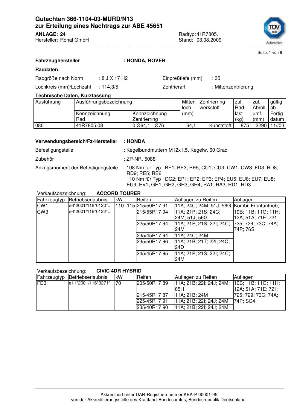 Dieses Gutachten (abe) bezieht sich auf die Alufelge Ronal 41R7805 in der Ausführung 8Jx17 ET 0, Mittenloch 0 mm (KBA 45651). Im PDF findest du typischerweise zulässige Reifengrößen, Auflagen/Anbauhinweise und – je nach Dokument – Hinweise zur Eintragung.
