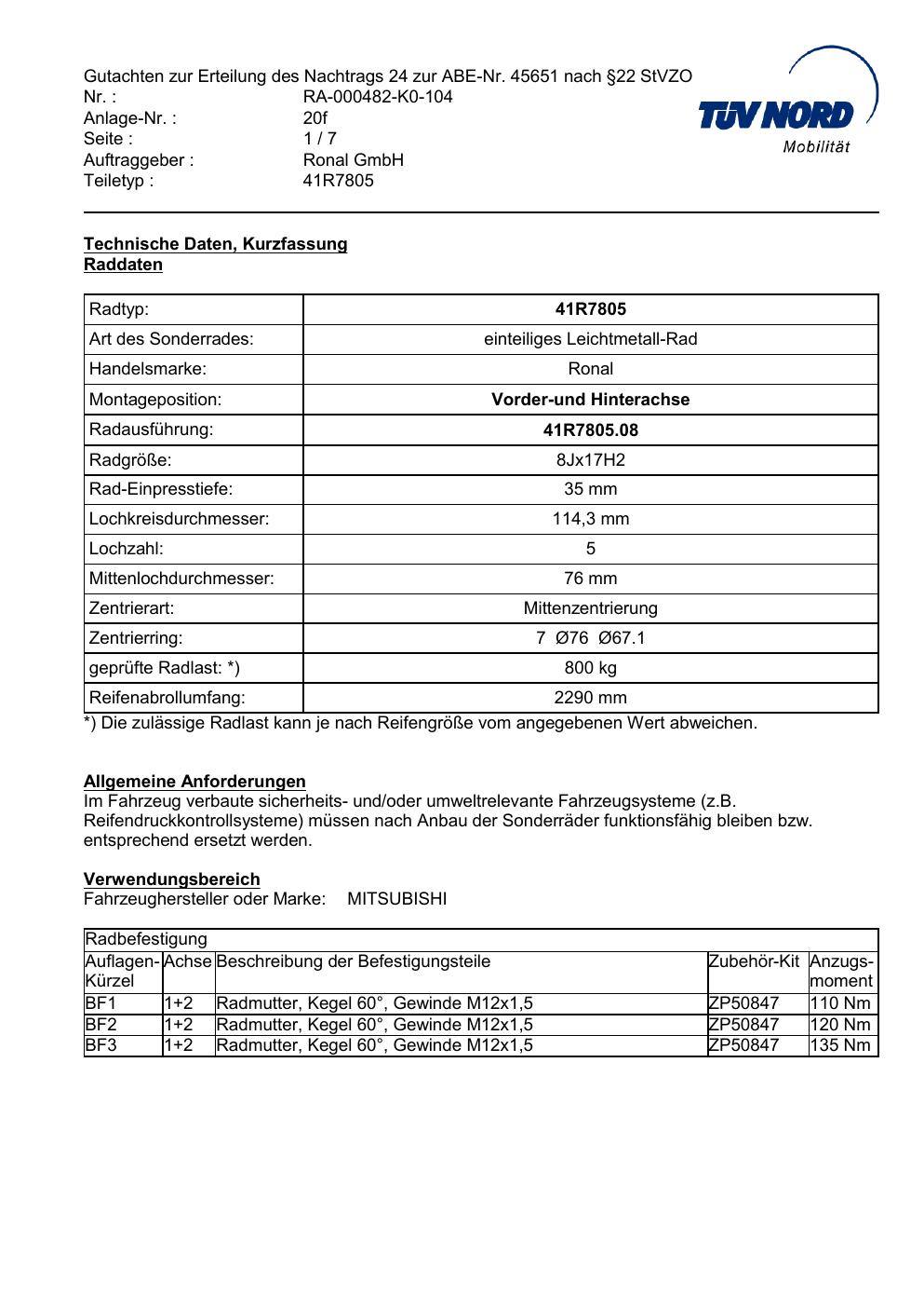 Dieses Gutachten (abe) bezieht sich auf die Alufelge brand-ronal 41R7805 in der Ausführung 8Jx17 ET 0, Mittenloch 0 mm (KBA 45651). Im PDF findest du typischerweise zulässige Reifengrößen, Auflagen/Anbauhinweise und – je nach Dokument – Hinweise zur Eintragung.