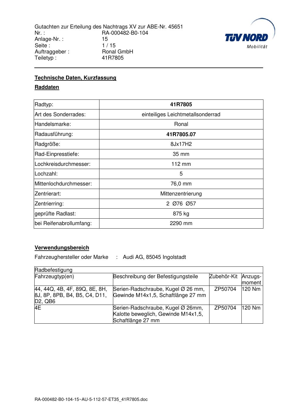 Dieses Gutachten (abe) bezieht sich auf die Alufelge brand-ronal 41R7805 in der Ausführung 8Jx17 ET 0, Mittenloch 0 mm (KBA 45651). Im PDF findest du typischerweise zulässige Reifengrößen, Auflagen/Anbauhinweise und – je nach Dokument – Hinweise zur Eintragung.