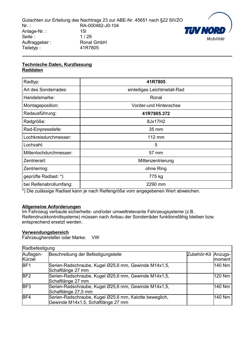 Dieses Gutachten (abe) bezieht sich auf die Alufelge brand-ronal 41R7805 in der Ausführung 8Jx17 ET 0, Mittenloch 0 mm (KBA 45651). Im PDF findest du typischerweise zulässige Reifengrößen, Auflagen/Anbauhinweise und – je nach Dokument – Hinweise zur Eintragung.