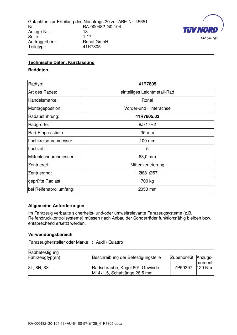 Dieses Gutachten (abe) bezieht sich auf die Alufelge brand-ronal 41R7805 in der Ausführung 8Jx17 ET 0, Mittenloch 0 mm (KBA 45651). Im PDF findest du typischerweise zulässige Reifengrößen, Auflagen/Anbauhinweise und – je nach Dokument – Hinweise zur Eintragung.