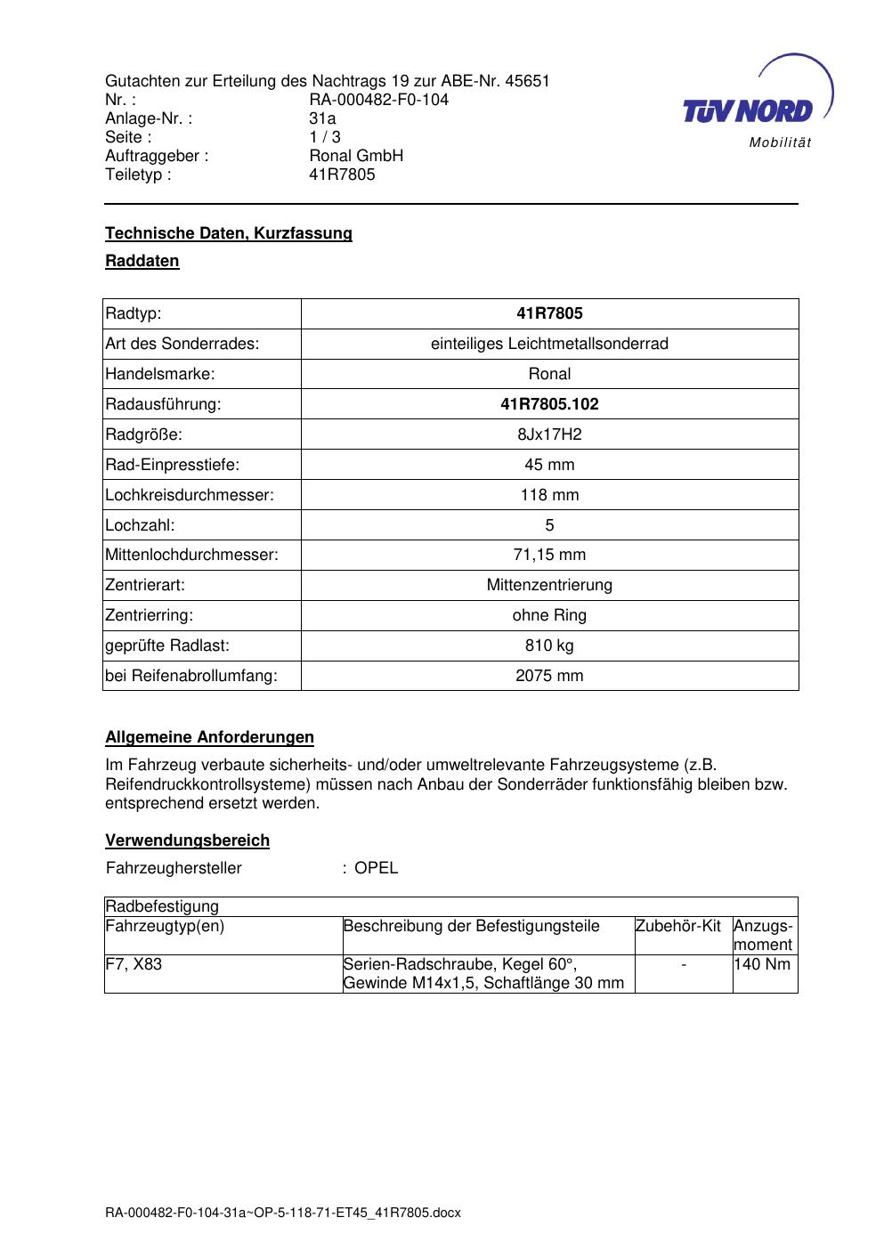 Dieses Gutachten (abe) bezieht sich auf die Alufelge brand-ronal 41R7805 in der Ausführung 8Jx17 ET 0, Mittenloch 0 mm (KBA 45651). Im PDF findest du typischerweise zulässige Reifengrößen, Auflagen/Anbauhinweise und – je nach Dokument – Hinweise zur Eintragung.