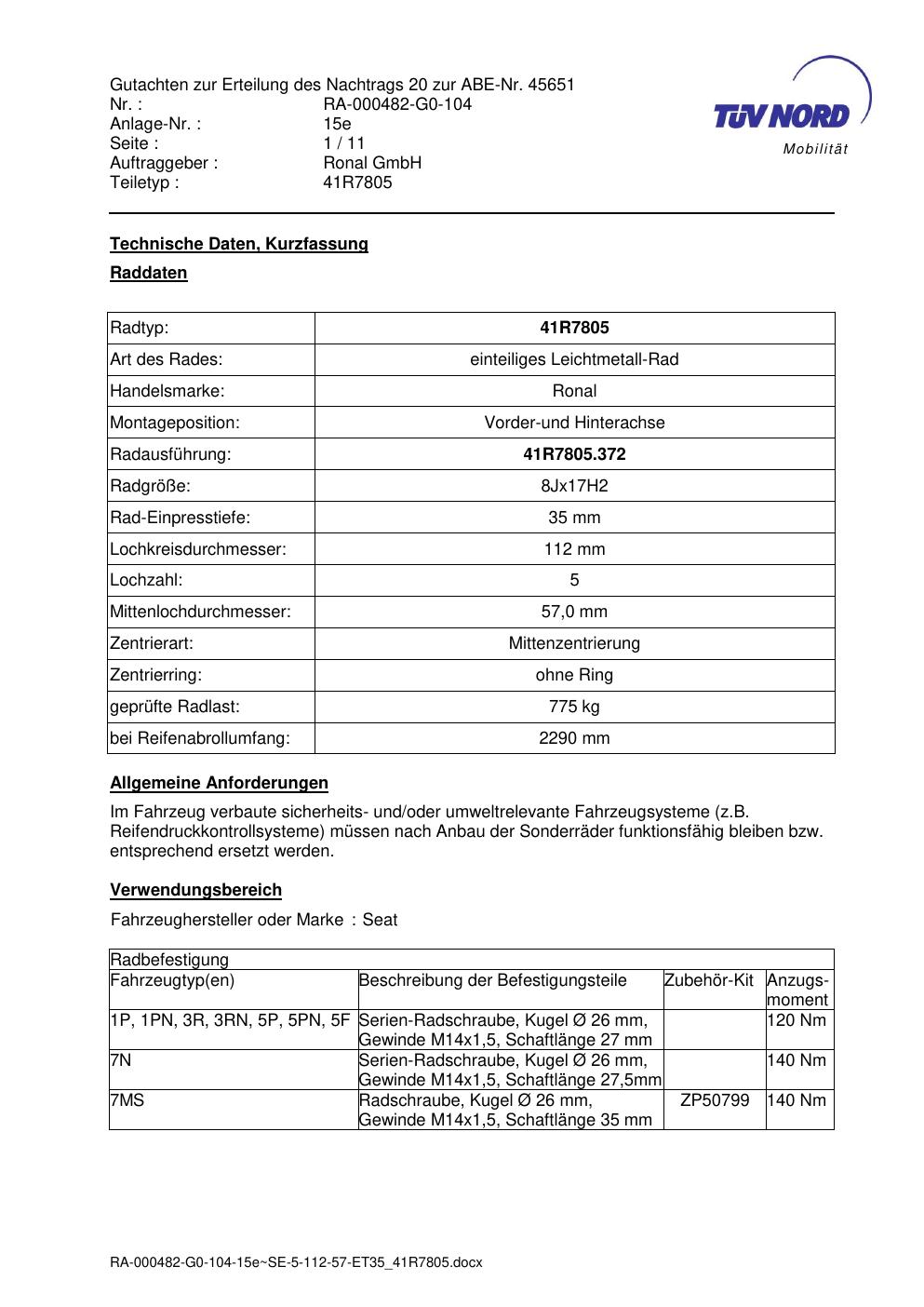 Dieses Gutachten (abe) bezieht sich auf die Alufelge brand-ronal 41R7805 in der Ausführung 8Jx17 ET 0, Mittenloch 0 mm (KBA 45651). Im PDF findest du typischerweise zulässige Reifengrößen, Auflagen/Anbauhinweise und – je nach Dokument – Hinweise zur Eintragung.