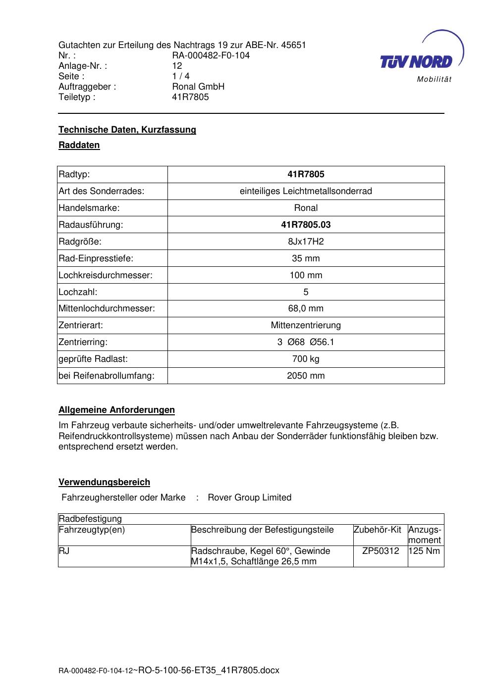 Dieses Gutachten (abe) bezieht sich auf die Alufelge brand-ronal 41R7805 in der Ausführung 8Jx17 ET 0, Mittenloch 0 mm (KBA 45651). Im PDF findest du typischerweise zulässige Reifengrößen, Auflagen/Anbauhinweise und – je nach Dokument – Hinweise zur Eintragung.