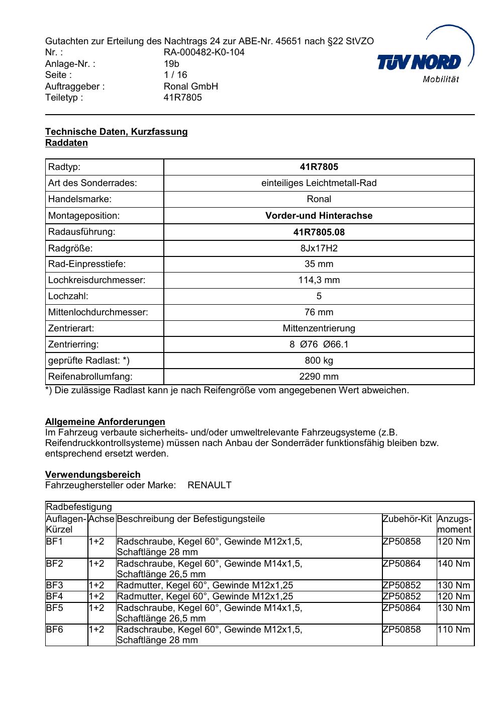 Dieses Gutachten (abe) bezieht sich auf die Alufelge brand-ronal 41R7805 in der Ausführung 8Jx17 ET 0, Mittenloch 0 mm (KBA 45651). Im PDF findest du typischerweise zulässige Reifengrößen, Auflagen/Anbauhinweise und – je nach Dokument – Hinweise zur Eintragung.