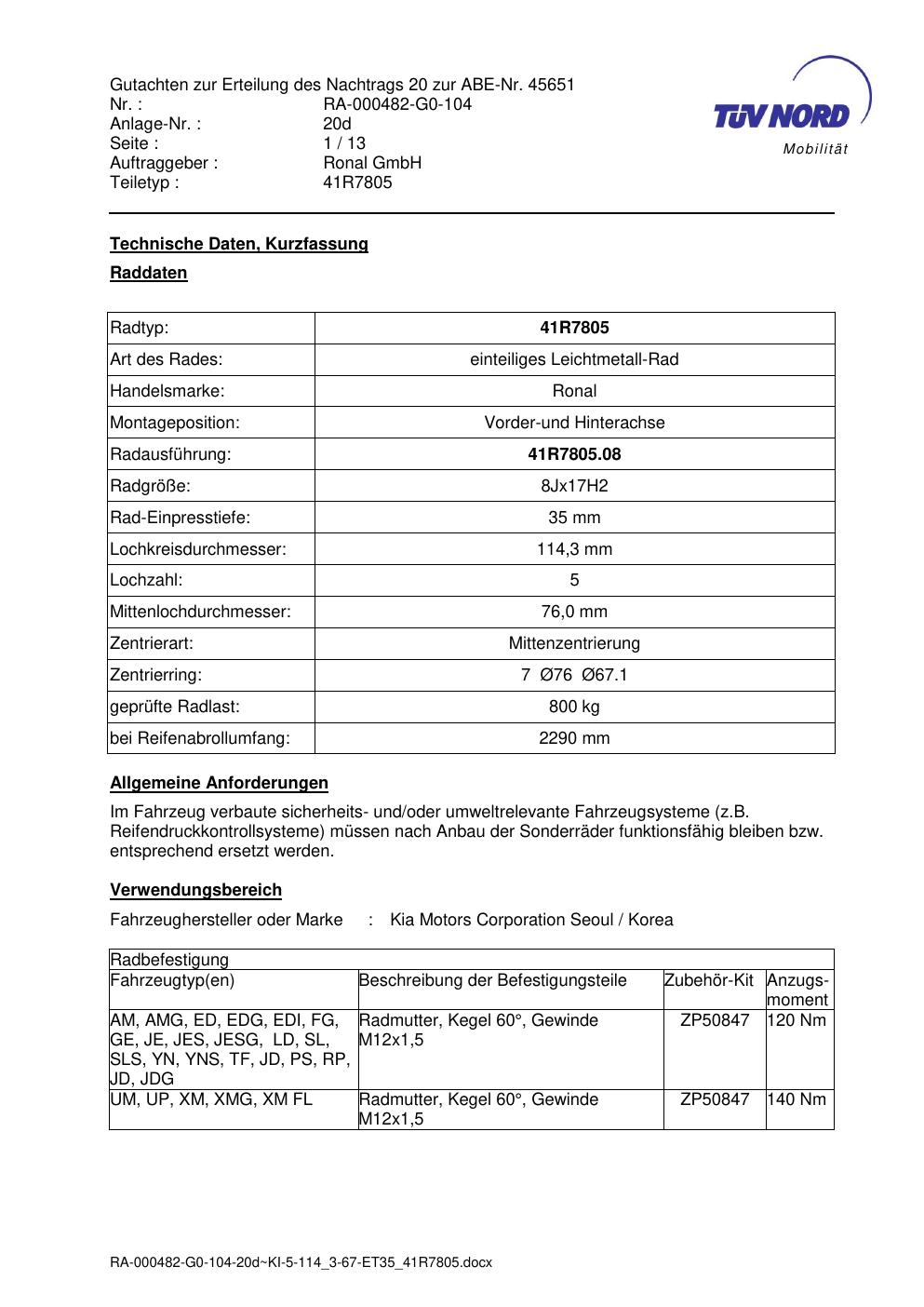 Dieses Gutachten (abe) bezieht sich auf die Alufelge brand-ronal 41R7805 in der Ausführung 8Jx17 ET 0, Mittenloch 0 mm (KBA 45651). Im PDF findest du typischerweise zulässige Reifengrößen, Auflagen/Anbauhinweise und – je nach Dokument – Hinweise zur Eintragung.