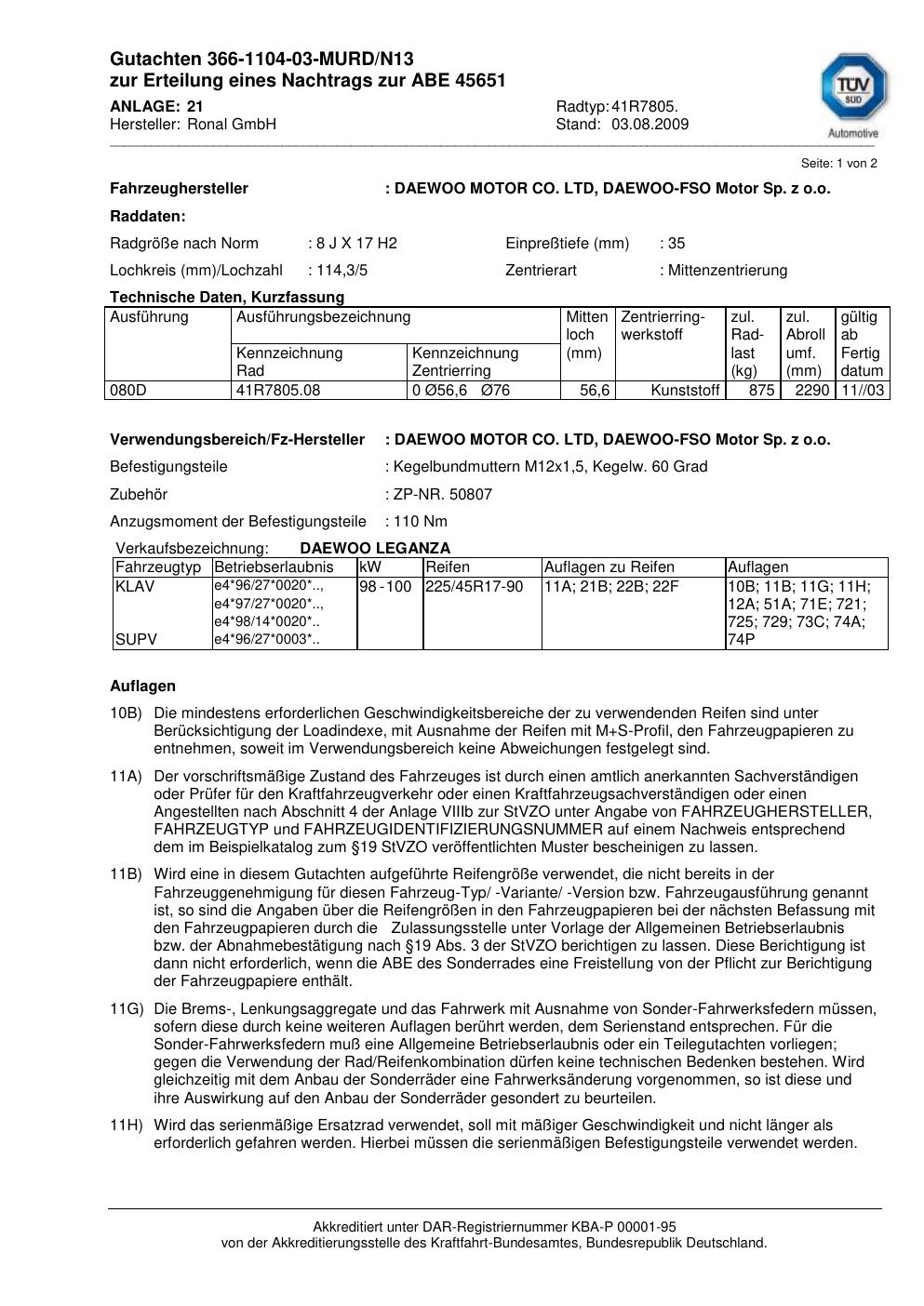 Dieses Gutachten (abe) bezieht sich auf die Alufelge Ronal 41R7805 in der Ausführung 8Jx17 ET 0, Mittenloch 0 mm (KBA 45651). Im PDF findest du typischerweise zulässige Reifengrößen, Auflagen/Anbauhinweise und – je nach Dokument – Hinweise zur Eintragung.