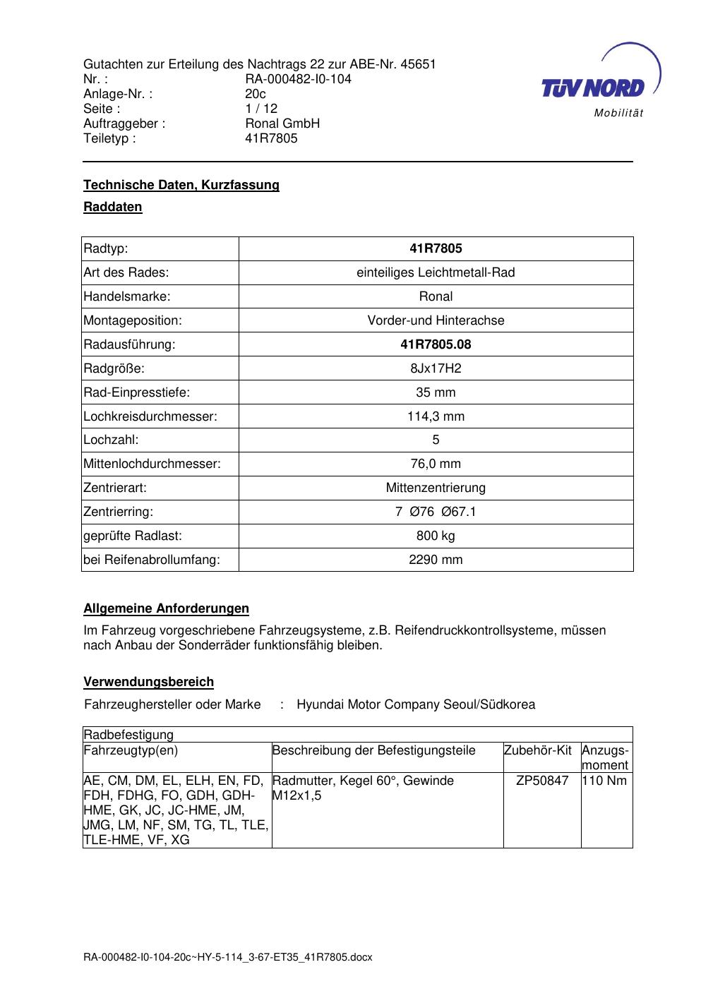 Dieses Gutachten (abe) bezieht sich auf die Alufelge brand-ronal 41R7805 in der Ausführung 8Jx17 ET 0, Mittenloch 0 mm (KBA 45651). Im PDF findest du typischerweise zulässige Reifengrößen, Auflagen/Anbauhinweise und – je nach Dokument – Hinweise zur Eintragung.