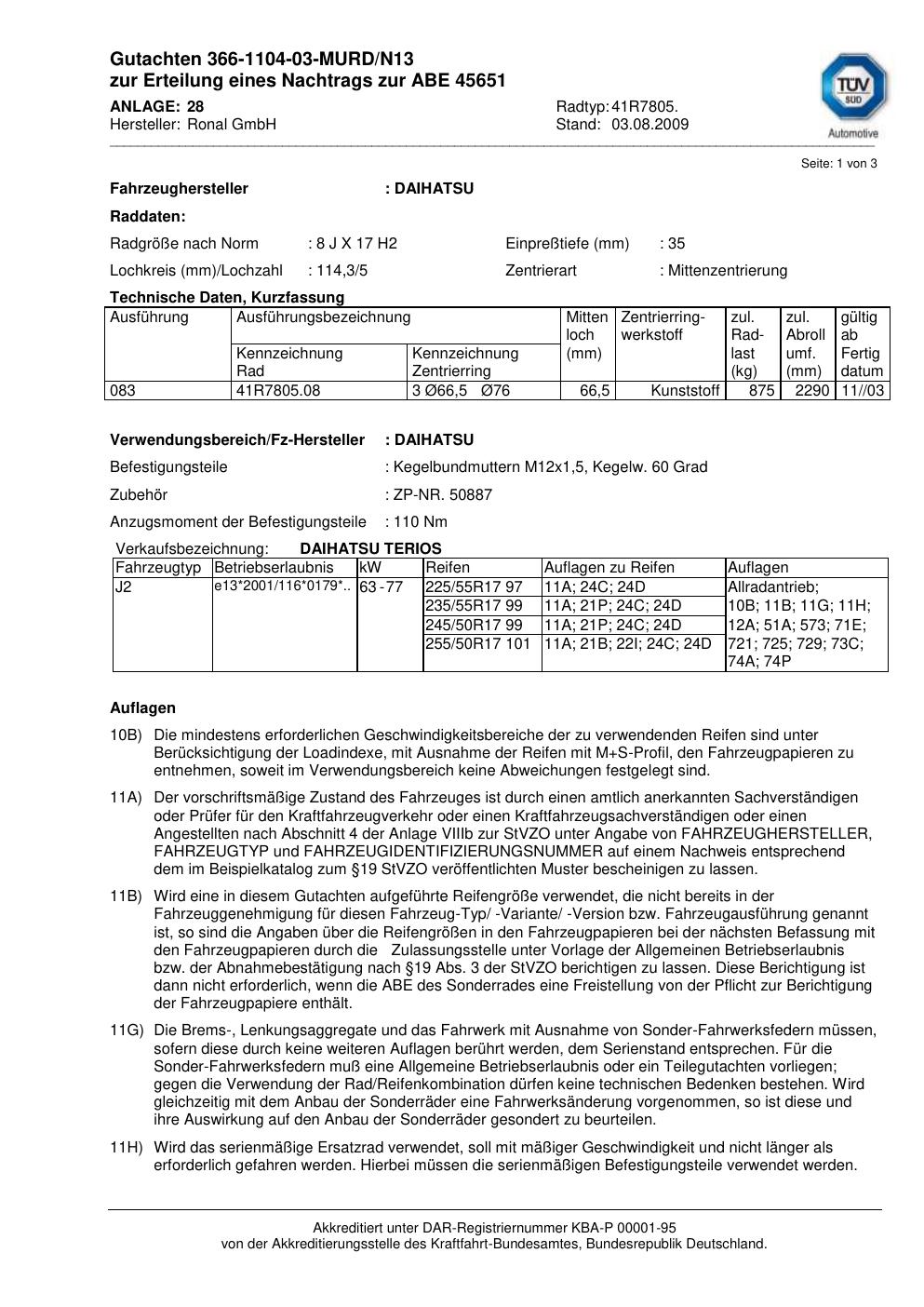 Dieses Gutachten (abe) bezieht sich auf die Alufelge Ronal 41R7805 in der Ausführung 8Jx17 ET 0, Mittenloch 0 mm (KBA 45651). Im PDF findest du typischerweise zulässige Reifengrößen, Auflagen/Anbauhinweise und – je nach Dokument – Hinweise zur Eintragung.