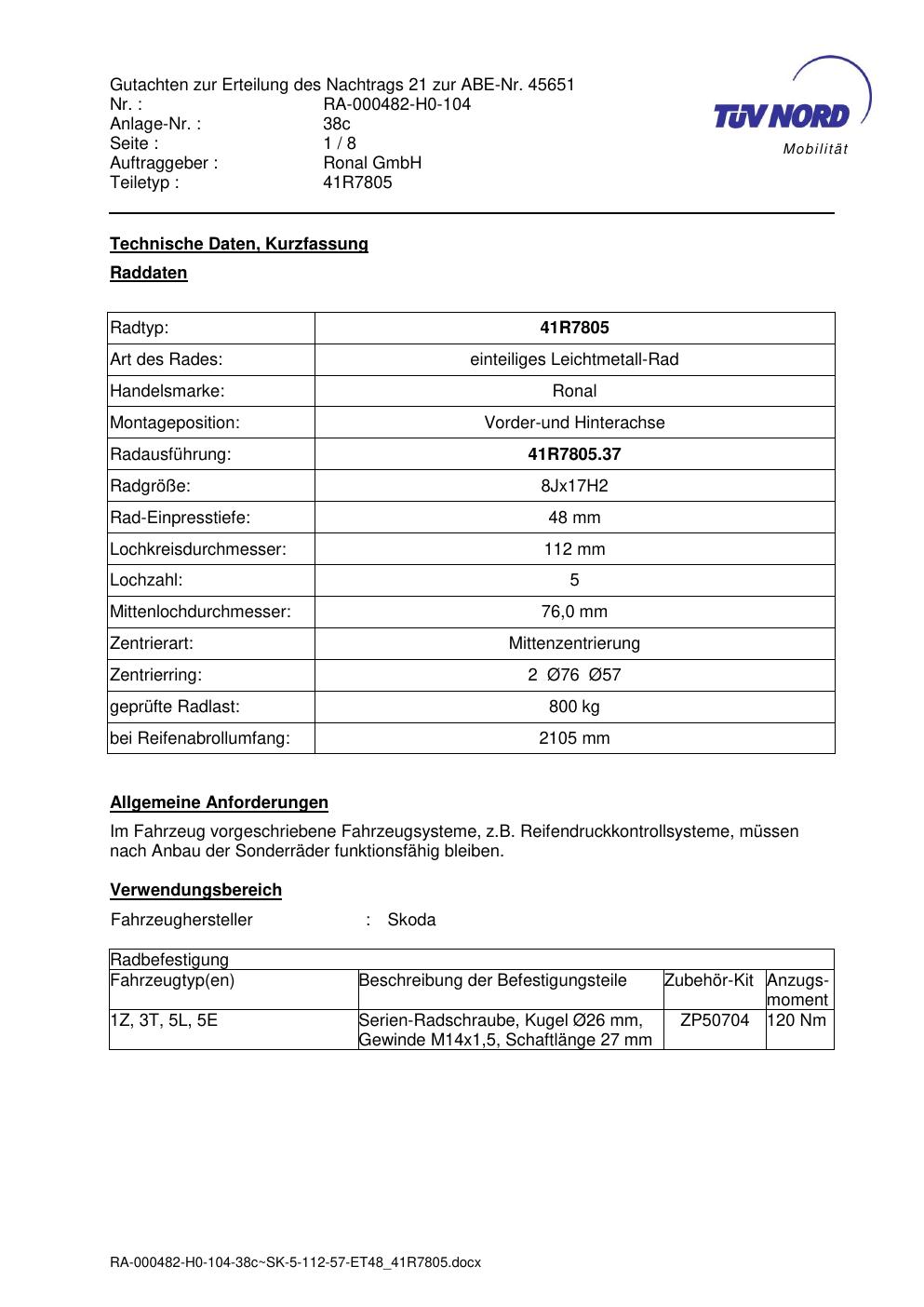 Dieses Gutachten (abe) bezieht sich auf die Alufelge brand-ronal 41R7805 in der Ausführung 8Jx17 ET 0, Mittenloch 0 mm (KBA 45651). Im PDF findest du typischerweise zulässige Reifengrößen, Auflagen/Anbauhinweise und – je nach Dokument – Hinweise zur Eintragung.