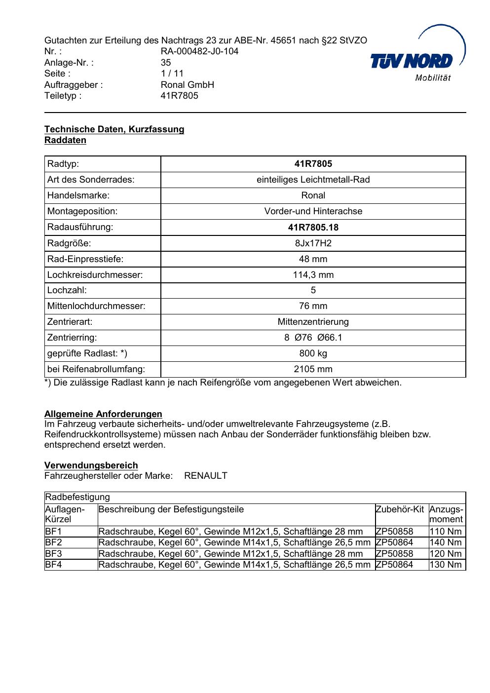 Dieses Gutachten (abe) bezieht sich auf die Alufelge brand-ronal 41R7805 in der Ausführung 8Jx17 ET 0, Mittenloch 0 mm (KBA 45651). Im PDF findest du typischerweise zulässige Reifengrößen, Auflagen/Anbauhinweise und – je nach Dokument – Hinweise zur Eintragung.