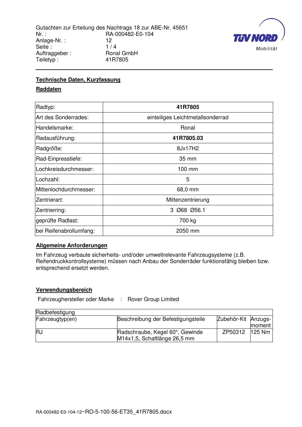 Dieses Gutachten (abe) bezieht sich auf die Alufelge brand-ronal 41R7805 in der Ausführung 8Jx17 ET 0, Mittenloch 0 mm (KBA 45651). Im PDF findest du typischerweise zulässige Reifengrößen, Auflagen/Anbauhinweise und – je nach Dokument – Hinweise zur Eintragung.