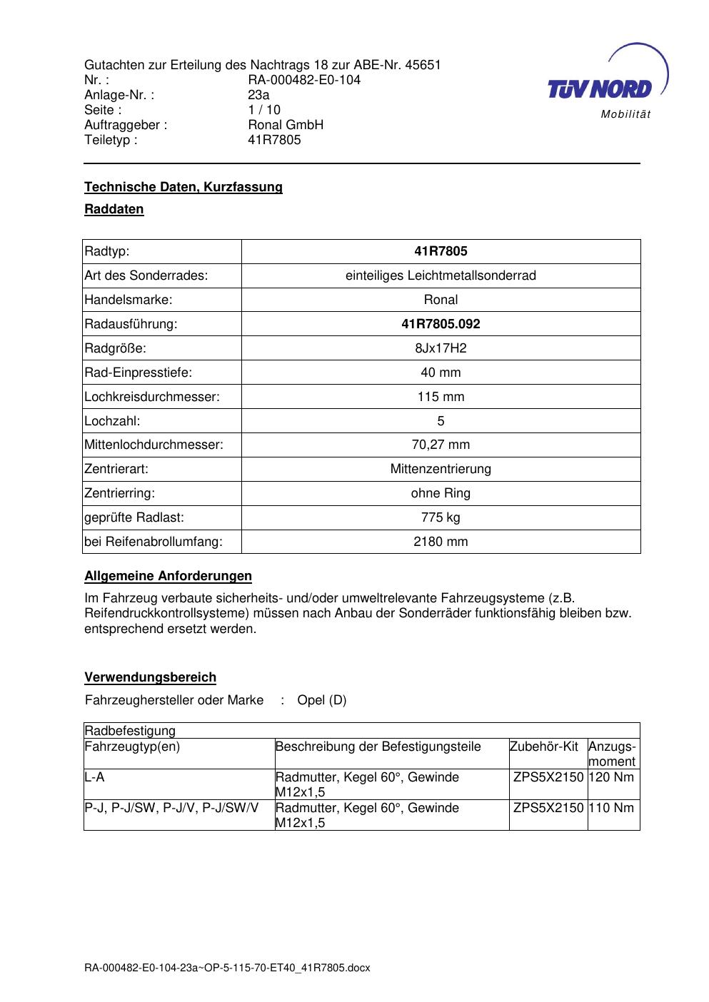 Dieses Gutachten (abe) bezieht sich auf die Alufelge brand-ronal 41R7805 in der Ausführung 8Jx17 ET 0, Mittenloch 0 mm (KBA 45651). Im PDF findest du typischerweise zulässige Reifengrößen, Auflagen/Anbauhinweise und – je nach Dokument – Hinweise zur Eintragung.