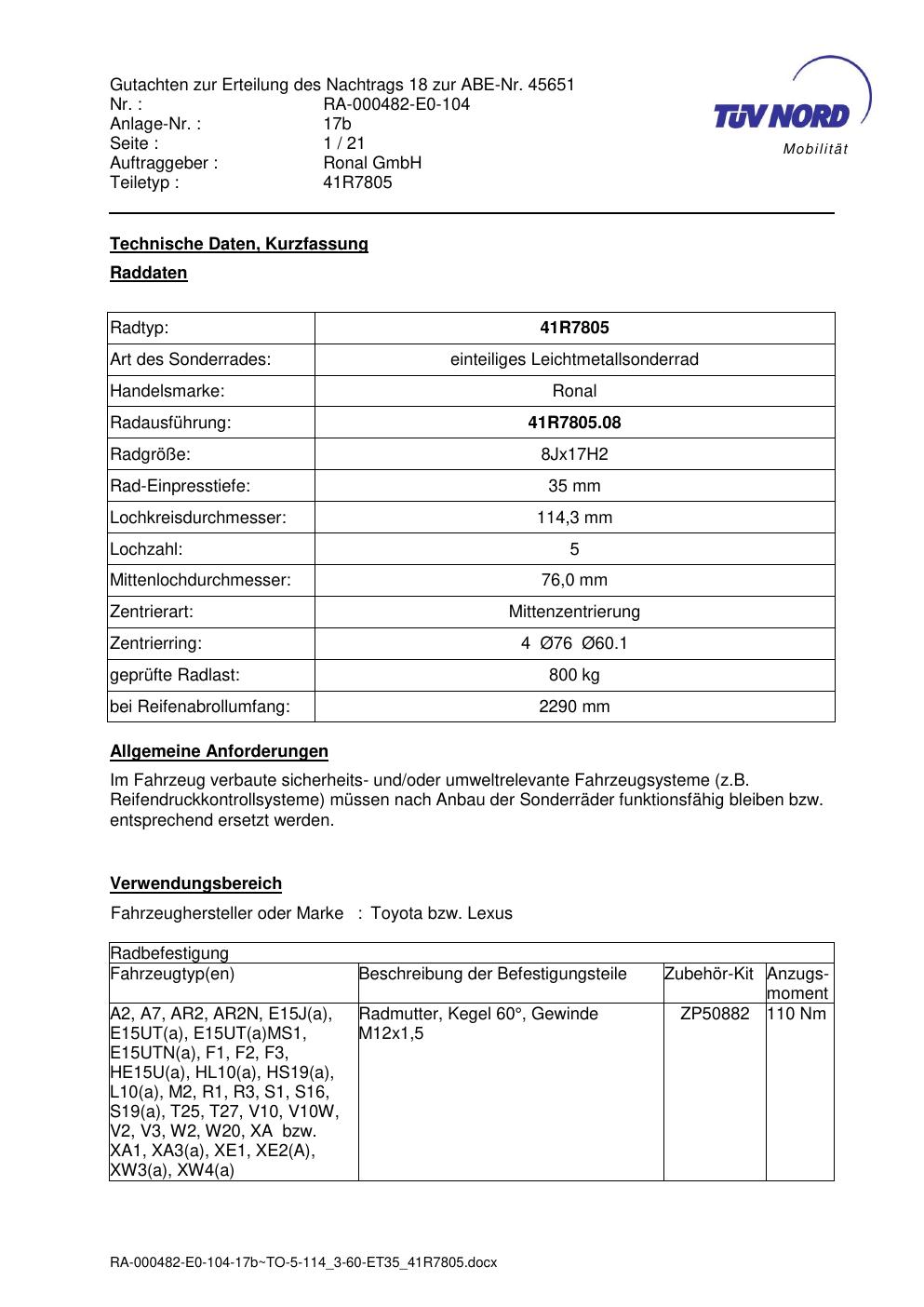 Dieses Gutachten (abe) bezieht sich auf die Alufelge brand-ronal 41R7805 in der Ausführung 8Jx17 ET 0, Mittenloch 0 mm (KBA 45651). Im PDF findest du typischerweise zulässige Reifengrößen, Auflagen/Anbauhinweise und – je nach Dokument – Hinweise zur Eintragung.