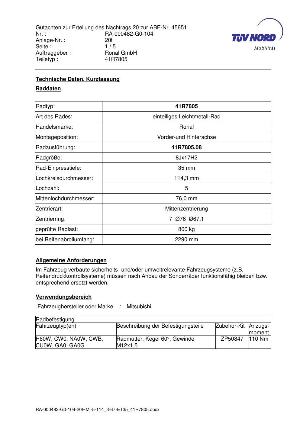 Dieses Gutachten (abe) bezieht sich auf die Alufelge brand-ronal 41R7805 in der Ausführung 8Jx17 ET 0, Mittenloch 0 mm (KBA 45651). Im PDF findest du typischerweise zulässige Reifengrößen, Auflagen/Anbauhinweise und – je nach Dokument – Hinweise zur Eintragung.