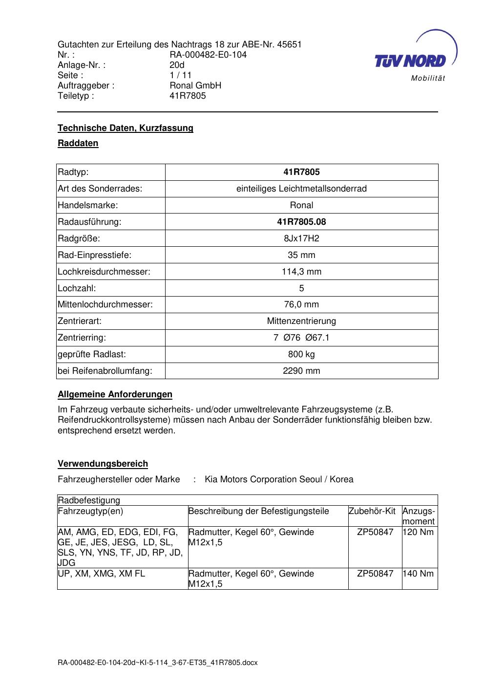Dieses Gutachten (abe) bezieht sich auf die Alufelge brand-ronal 41R7805 in der Ausführung 8Jx17 ET 0, Mittenloch 0 mm (KBA 45651). Im PDF findest du typischerweise zulässige Reifengrößen, Auflagen/Anbauhinweise und – je nach Dokument – Hinweise zur Eintragung.