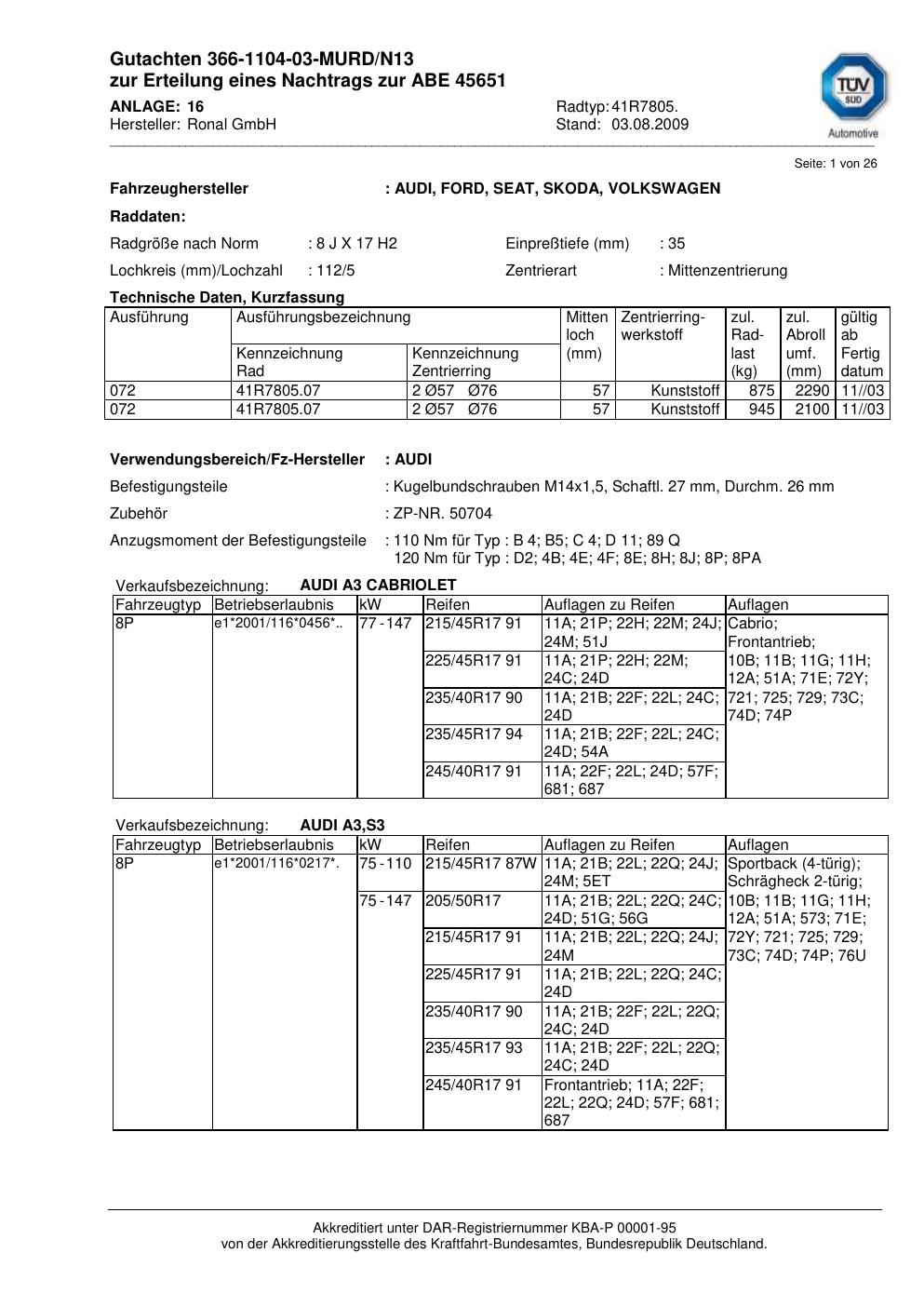 Dieses Gutachten (abe) bezieht sich auf die Alufelge Ronal 41R7805 in der Ausführung 8Jx17 ET 0, Mittenloch 0 mm (KBA 45651). Im PDF findest du typischerweise zulässige Reifengrößen, Auflagen/Anbauhinweise und – je nach Dokument – Hinweise zur Eintragung.