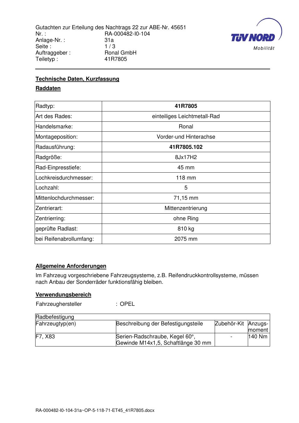 Dieses Gutachten (abe) bezieht sich auf die Alufelge brand-ronal 41R7805 in der Ausführung 8Jx17 ET 0, Mittenloch 0 mm (KBA 45651). Im PDF findest du typischerweise zulässige Reifengrößen, Auflagen/Anbauhinweise und – je nach Dokument – Hinweise zur Eintragung.
