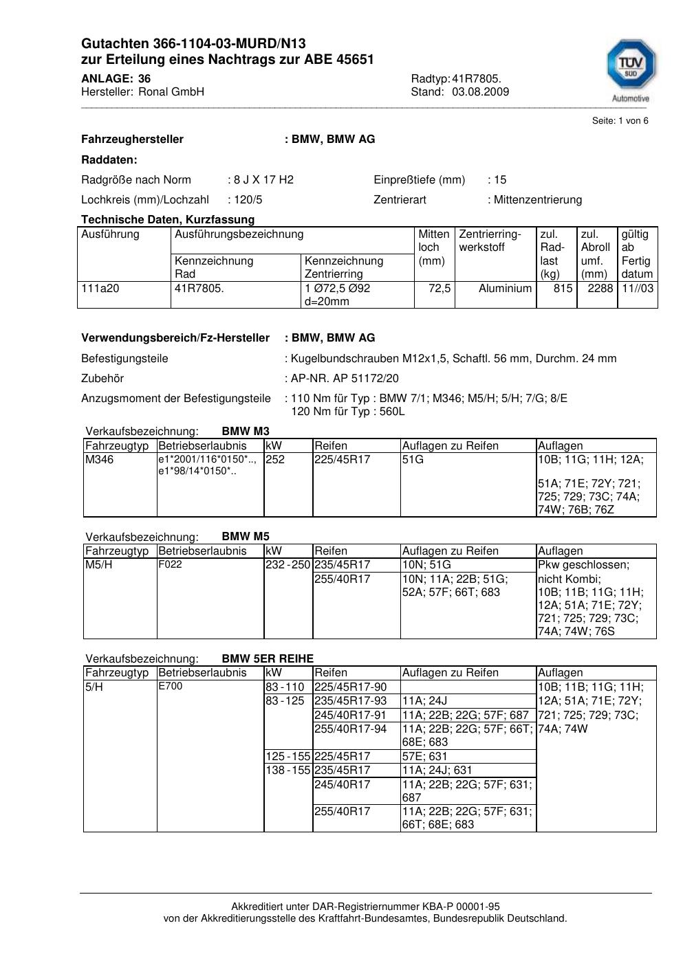 Dieses Gutachten (abe) bezieht sich auf die Alufelge brand-ronal 41R7805 in der Ausführung 8Jx17 ET 0, Mittenloch 0 mm (KBA 45651). Im PDF findest du typischerweise zulässige Reifengrößen, Auflagen/Anbauhinweise und – je nach Dokument – Hinweise zur Eintragung.