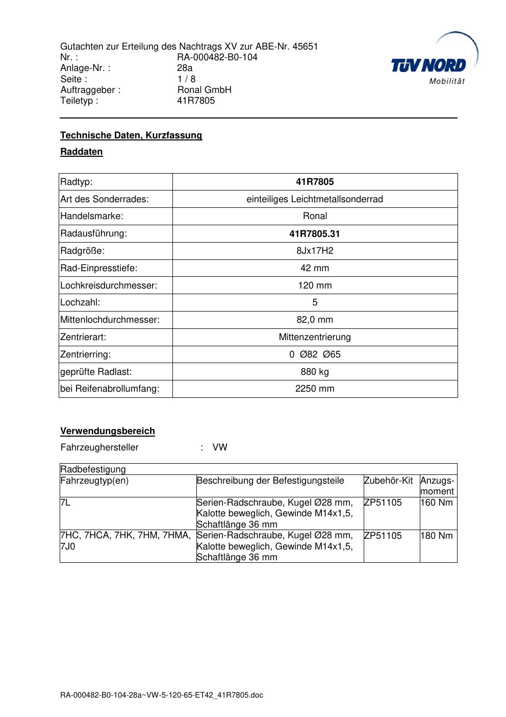 Dieses Gutachten (abe) bezieht sich auf die Alufelge brand-ronal 41R7805 in der Ausführung 8Jx17 ET 0, Mittenloch 0 mm (KBA 45651). Im PDF findest du typischerweise zulässige Reifengrößen, Auflagen/Anbauhinweise und – je nach Dokument – Hinweise zur Eintragung.